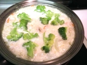 沸騰したら塩・こしょうで味付けをして、吹きこぼれない火加減にする。10分くらい煮込んだら、ブロッコリーをいれ、3分くらい煮込む。
