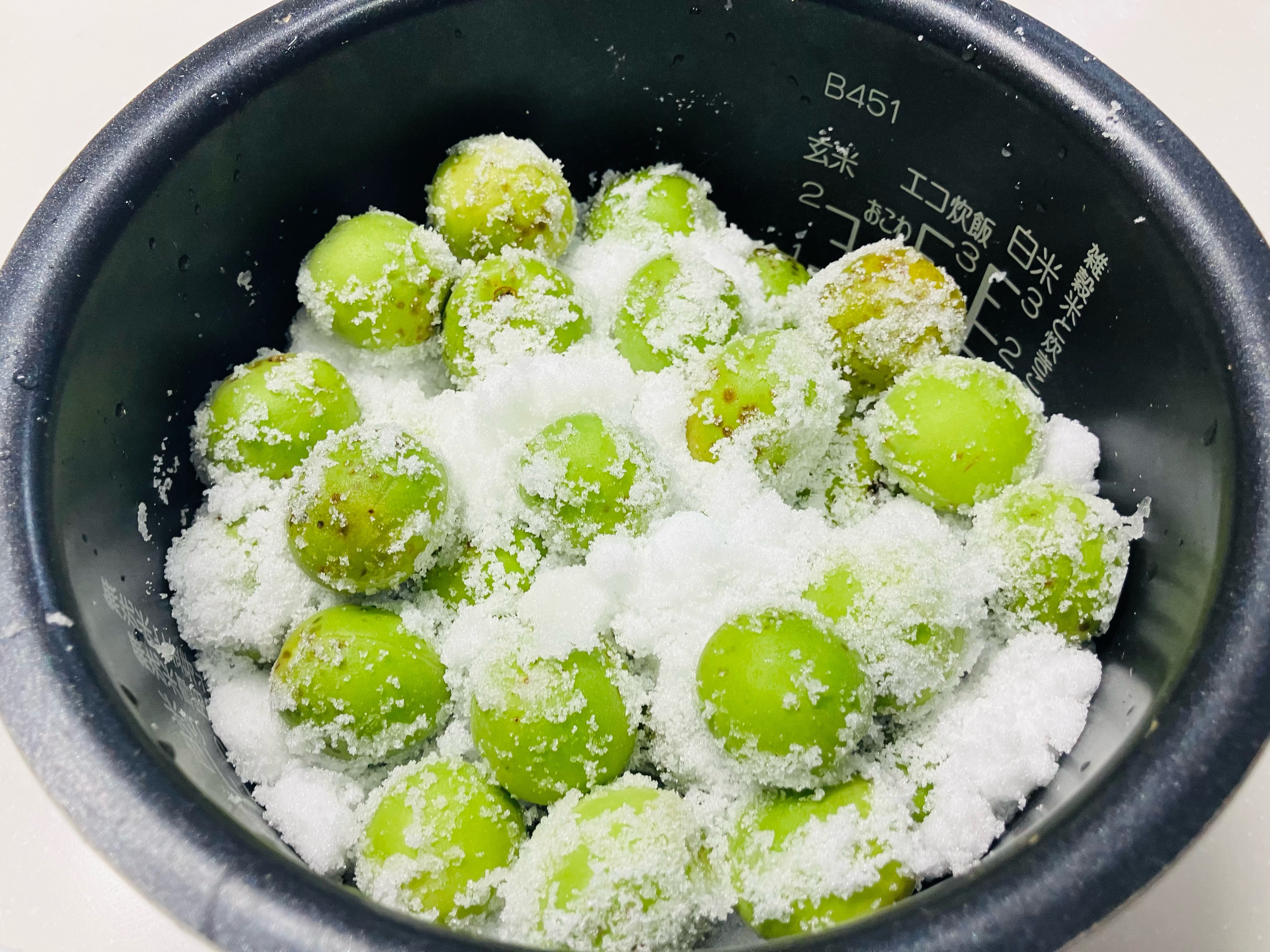 炊飯器に砂糖を半量入れてから青梅を入れます。