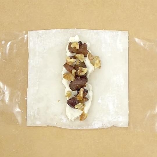 ぎゅうひクレープの上にクリームチーズ、渋皮栗ダイスカット、刻みクルミを順にのせて、スティック状に巻きます