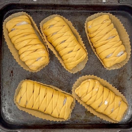 生地を12~13cmの四角に伸ばし広げて、中心に工程4)のフィリングをのせます