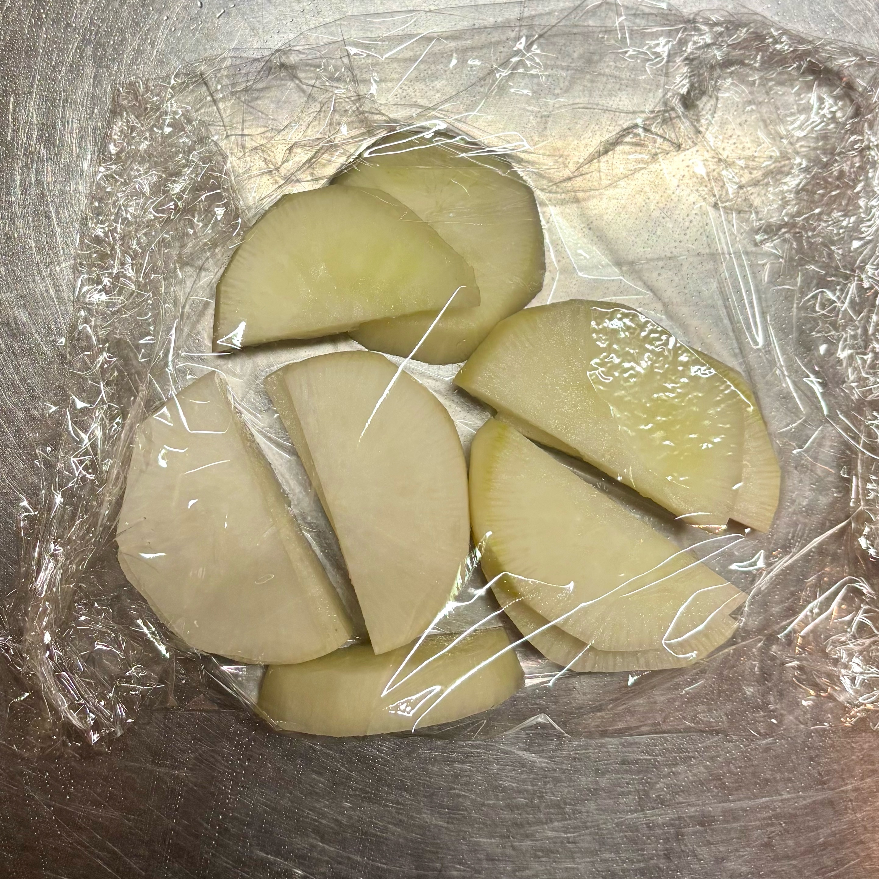 大根は1㎝厚さの半月切りにし、ラップに包んで電子レンジ(600W)に4分かける。