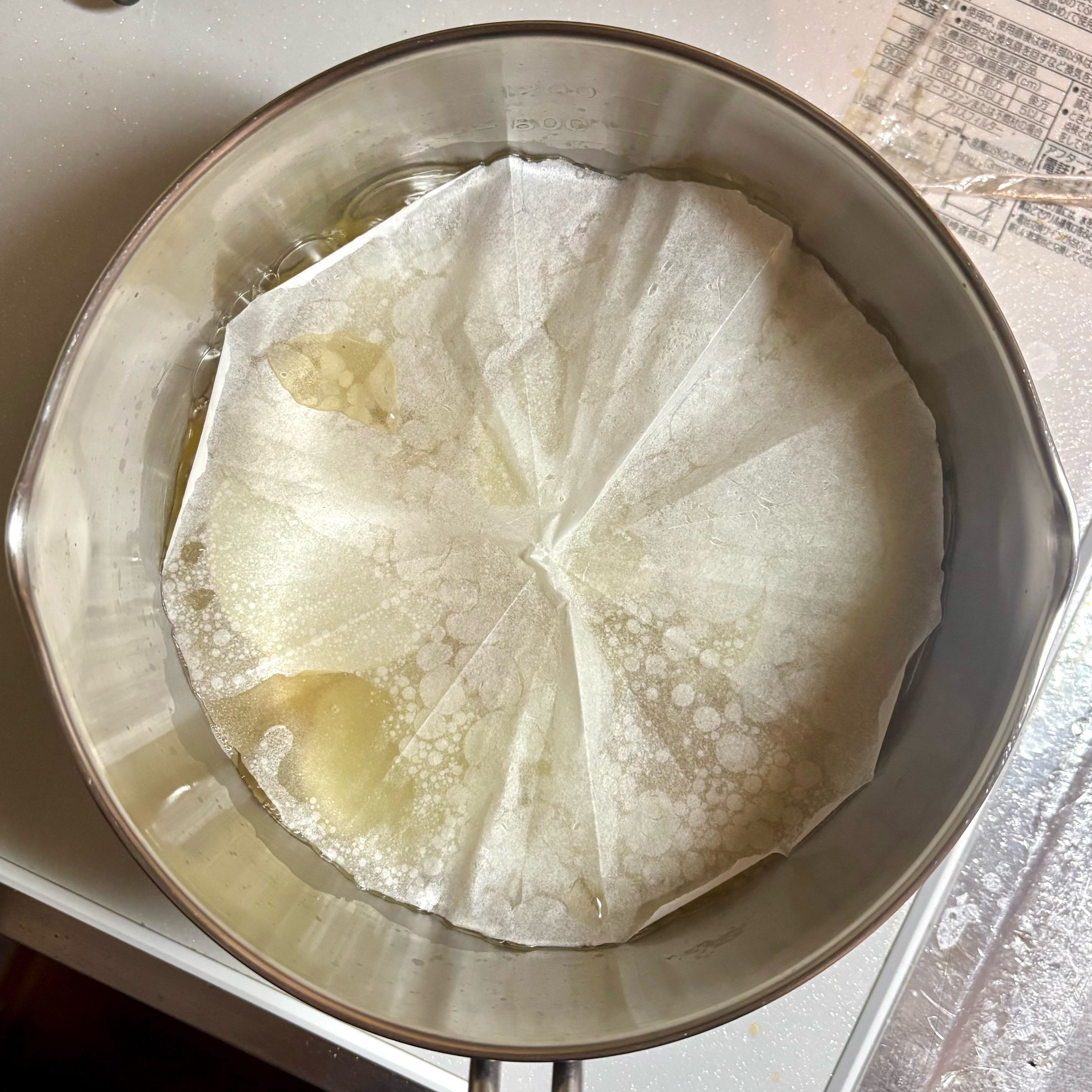 煮立ったらオーブンペーパーで落としぶたをし、大根が柔らかくなるまで弱めの中火で8分ほど煮る。