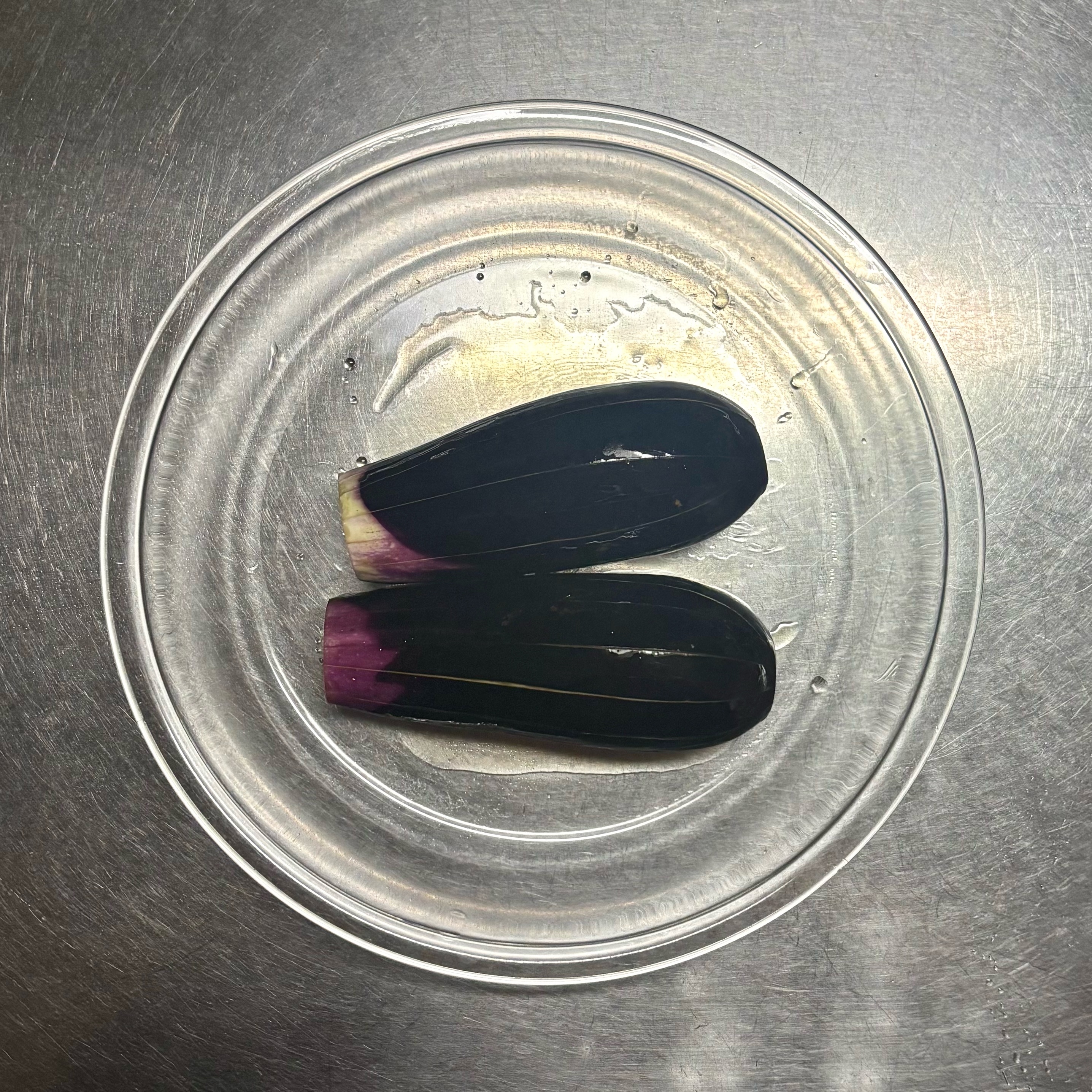なすはヘタを切り落とし、皮目に縦に6〜7本切り込みを入れ、ごま油大さじ1/2を全体にまぶす。