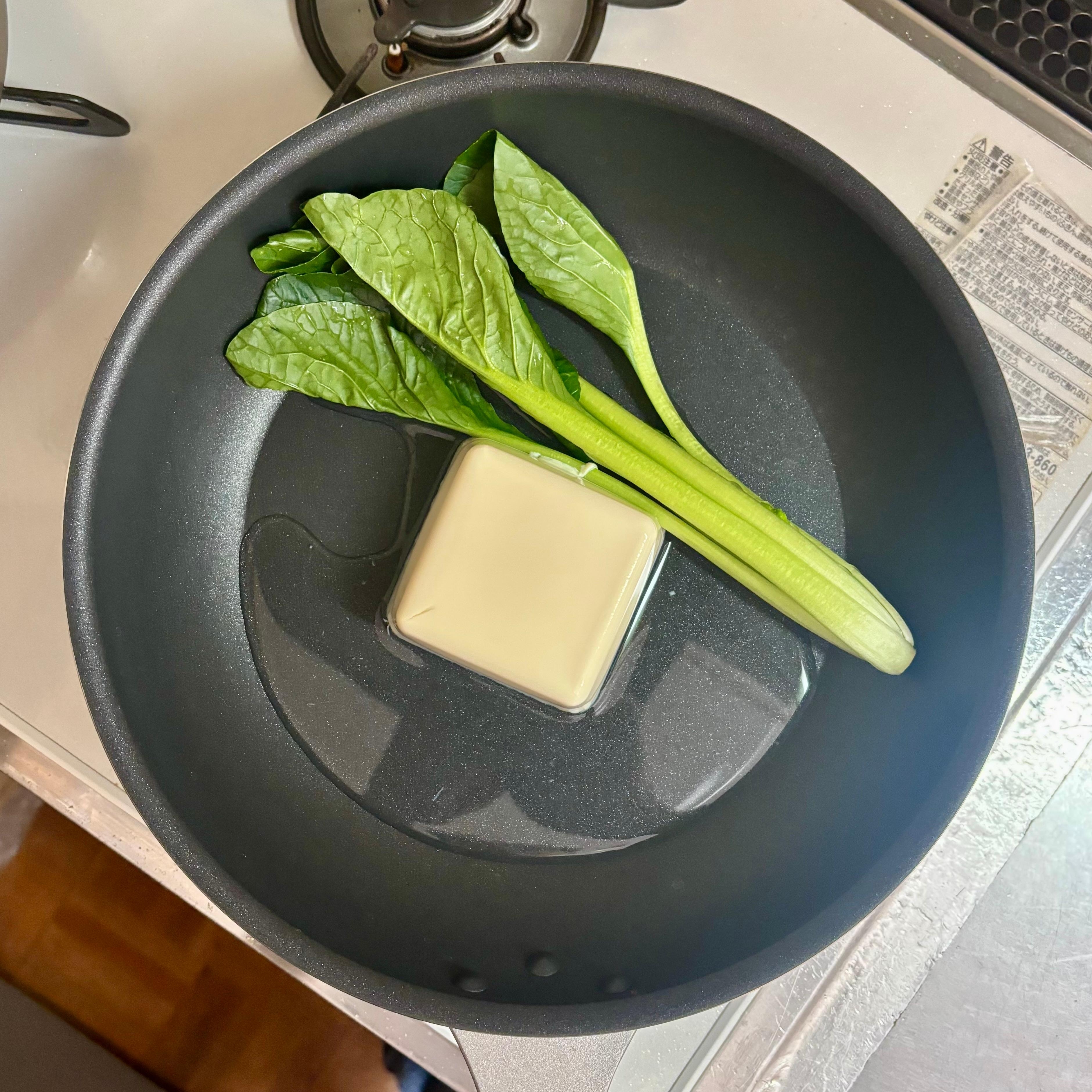 フライパンに豆腐、小松菜、水カップ1/4を入れ、ふたをして中火にかける。