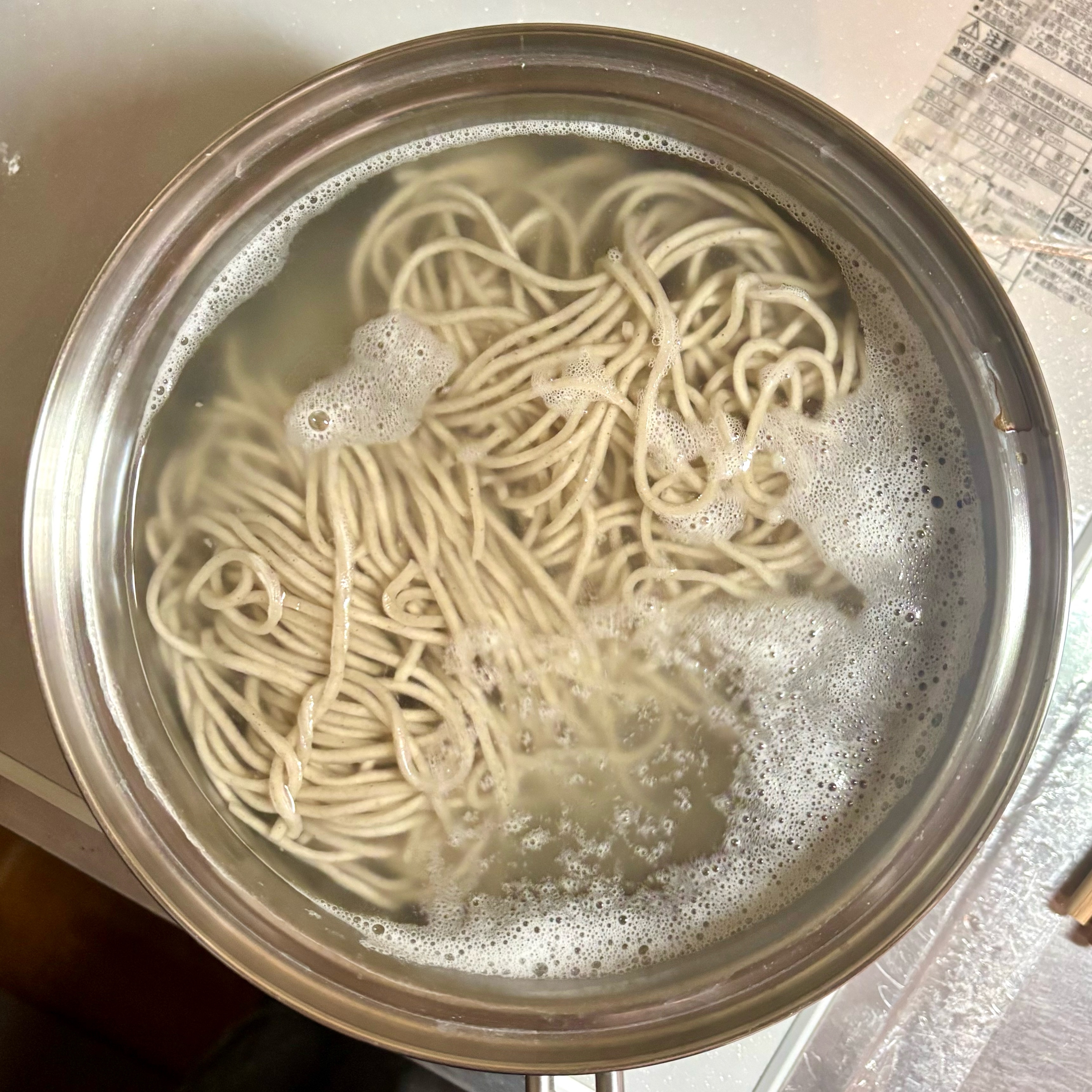 別の鍋にたっぷりの湯を沸かしてそばを入れ、袋の表示時間通りにゆでる。