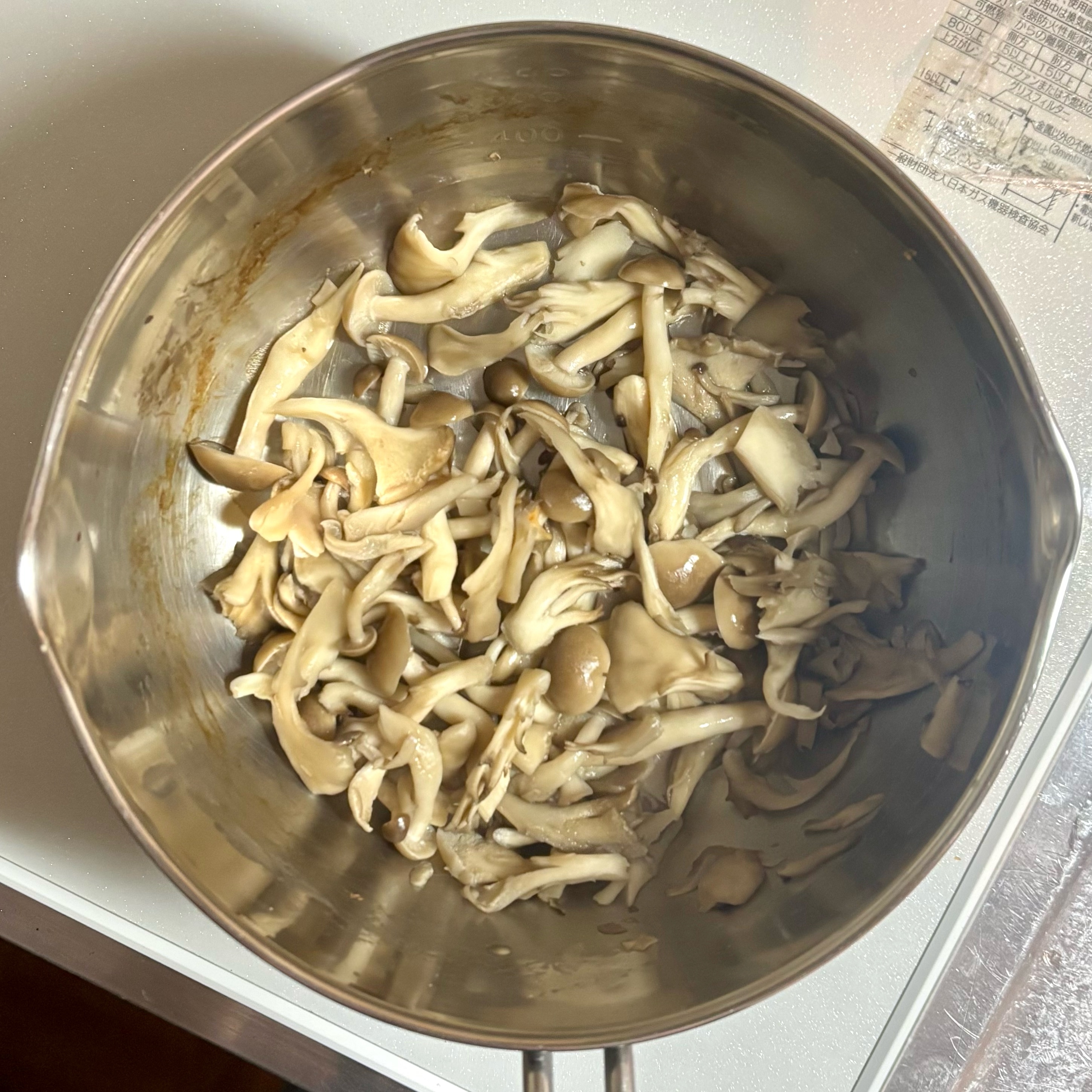鍋にしめじ、まいたけ、【A】(酒大さじ1、塩ひとつまみ)を入れて中火にかけ、汁気がほとんどなくなるまで3分ほど炒る。