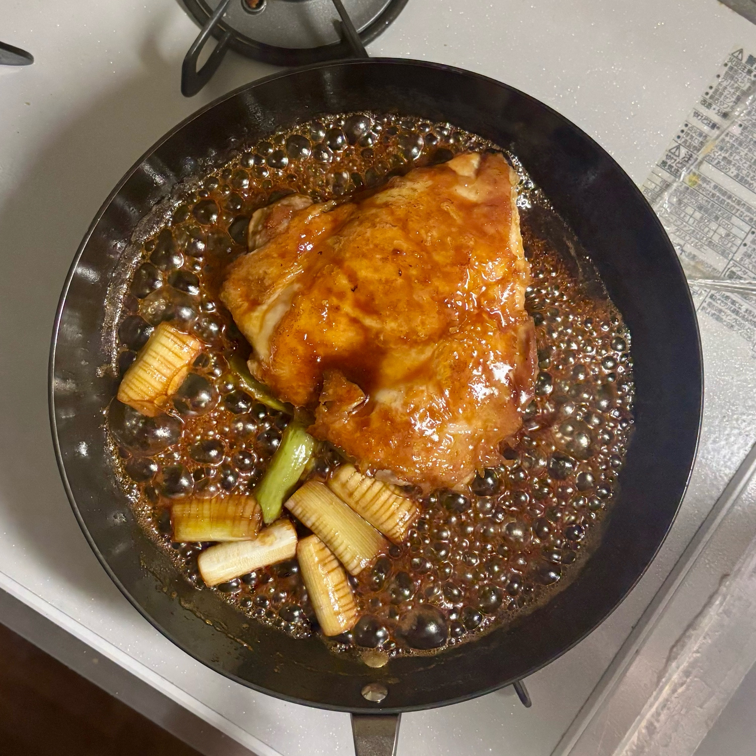 長ねぎを加え、たれをすくって鶏肉にかけながら、たれがトロリとするまでさらに2分ほど煮詰める。