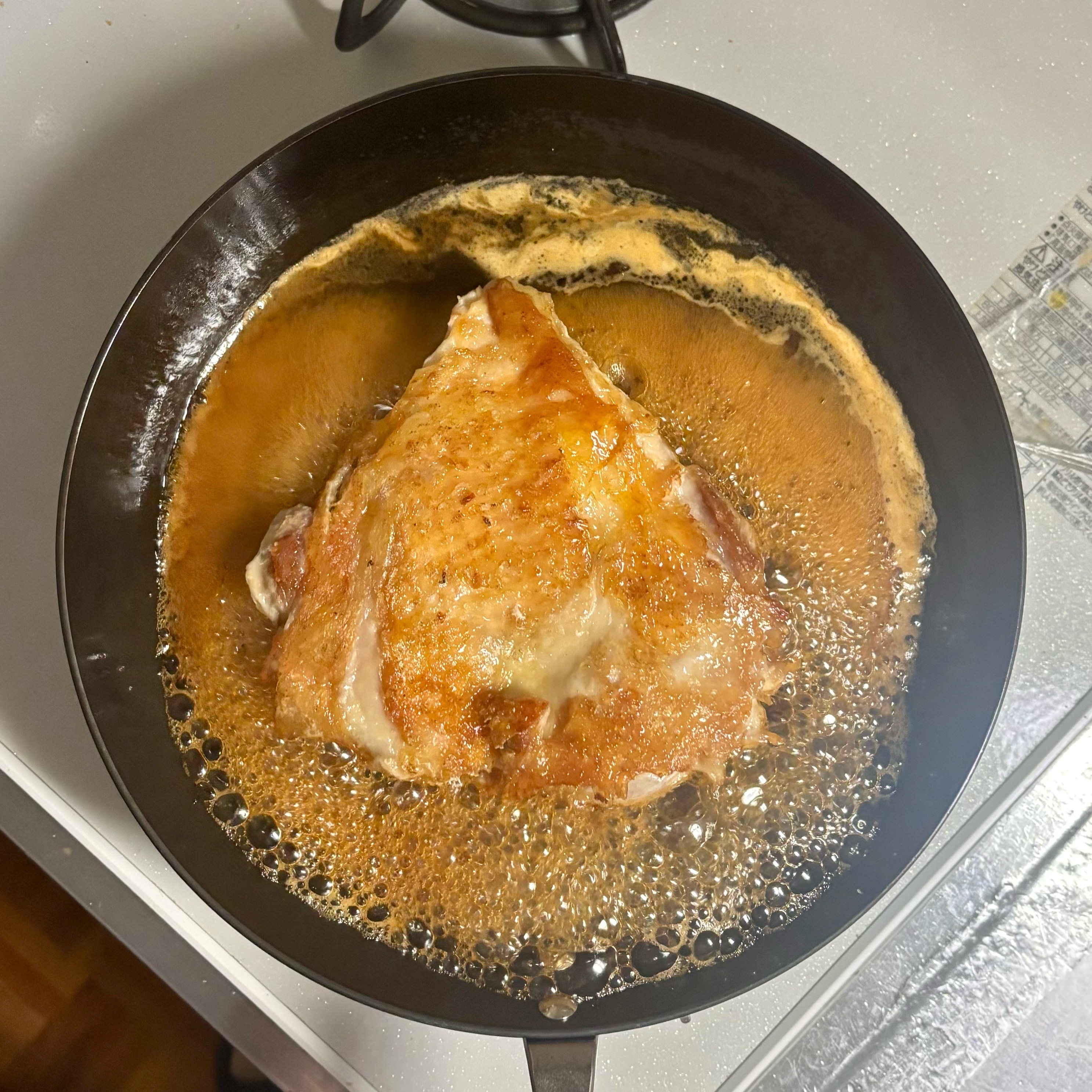 鶏肉を裏返して余分な脂をクッキングペーパーで軽く拭き、【A】を鶏肉の周囲から加える。