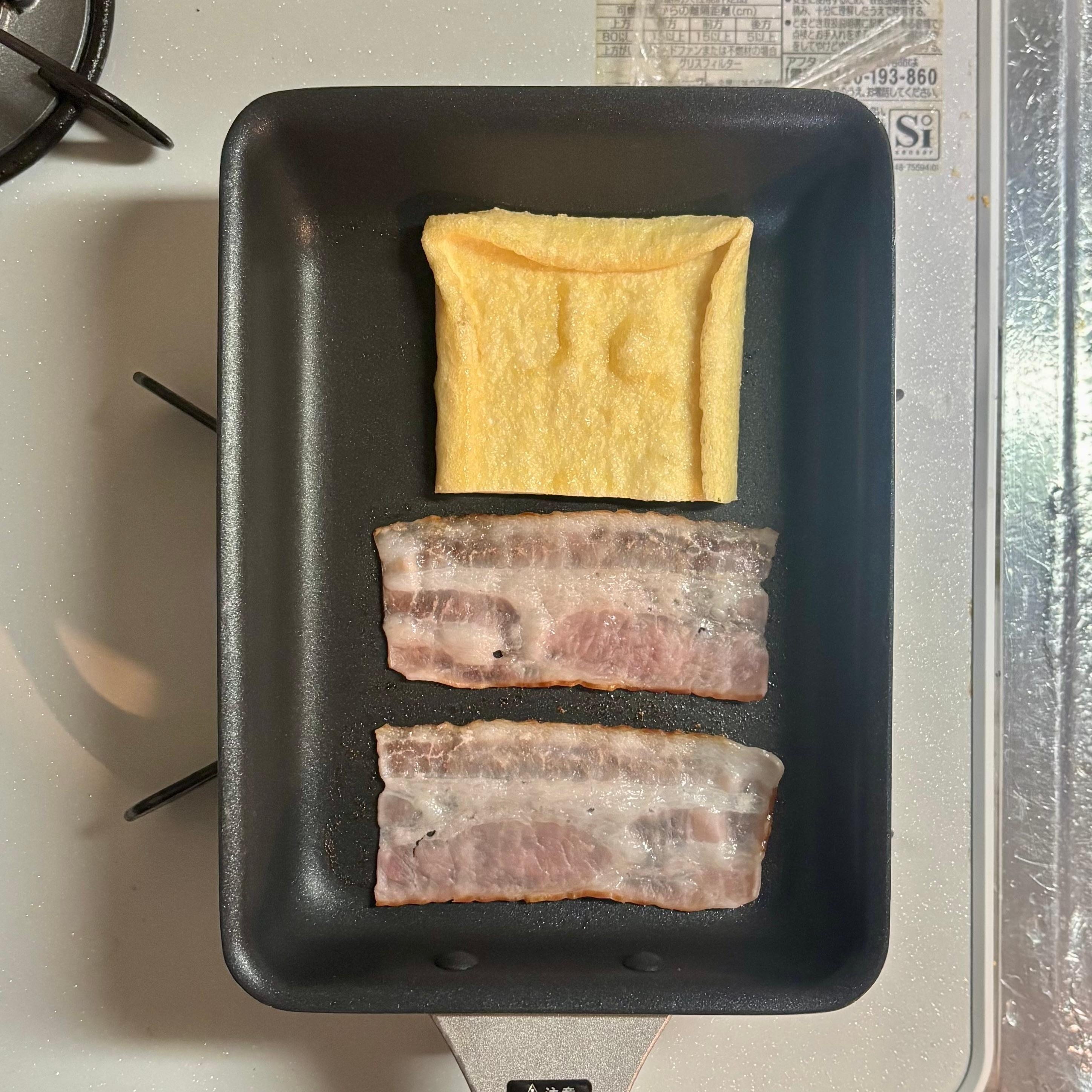 工程1で、焼いている途中にベーコンが焦げそうになったときは、油揚げにのせる。