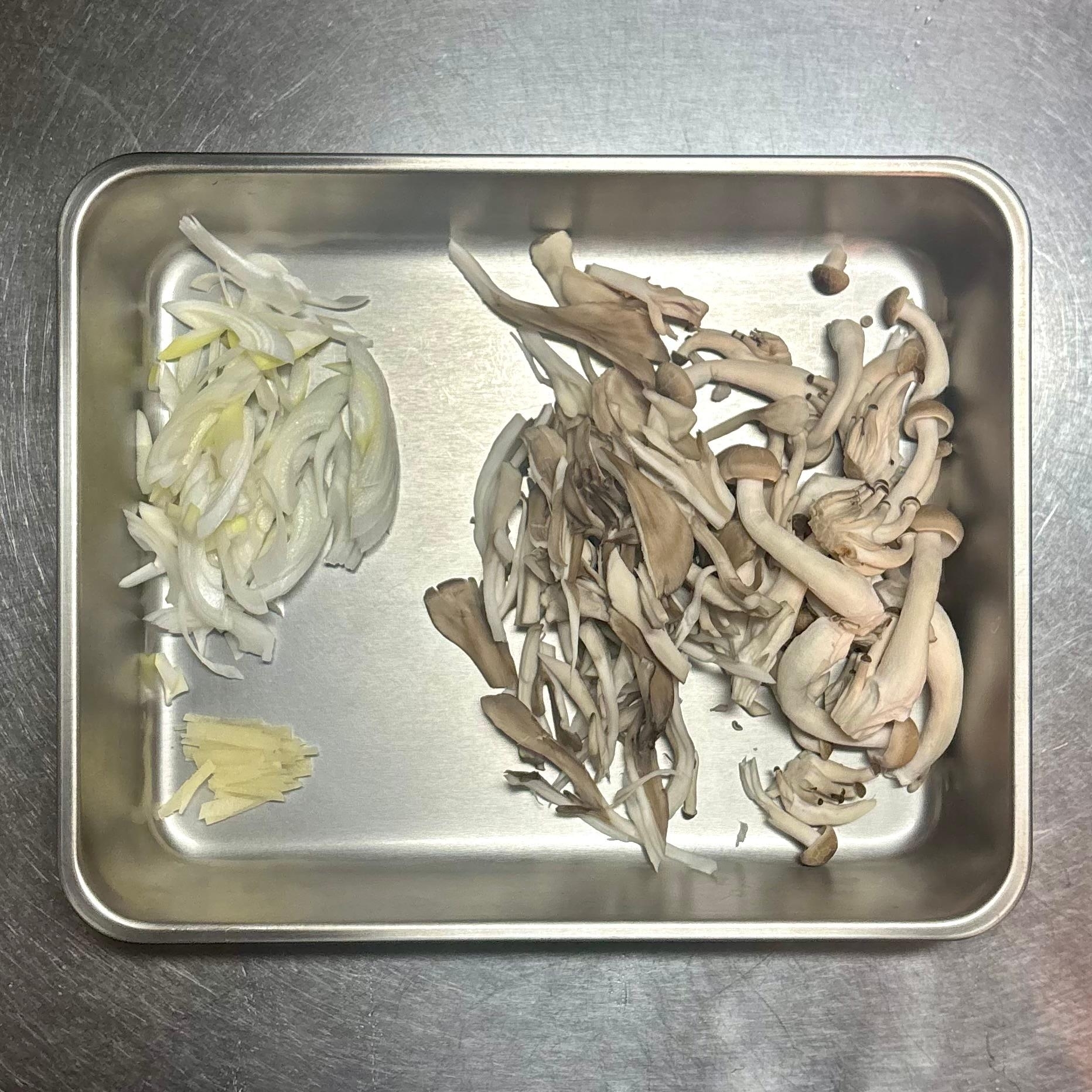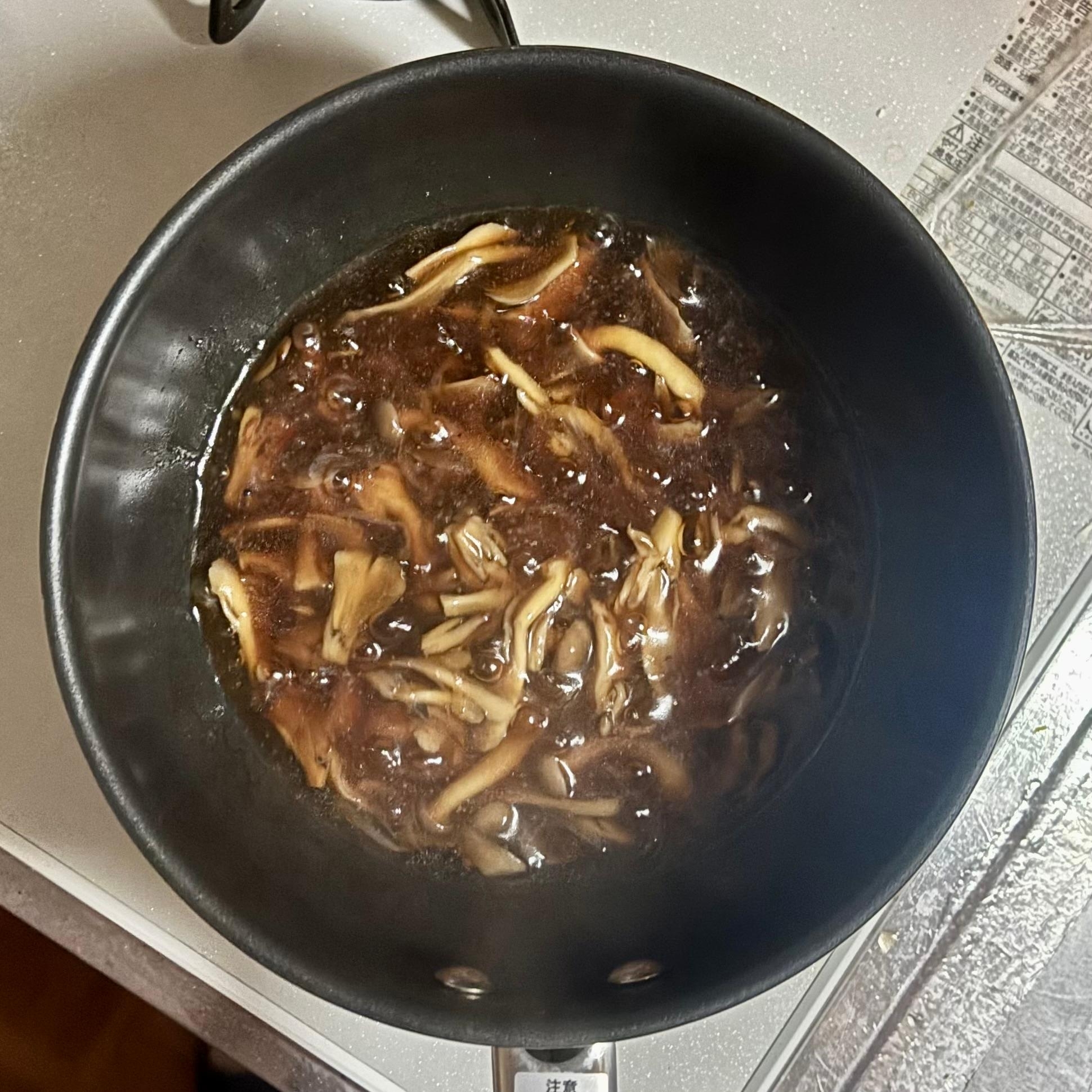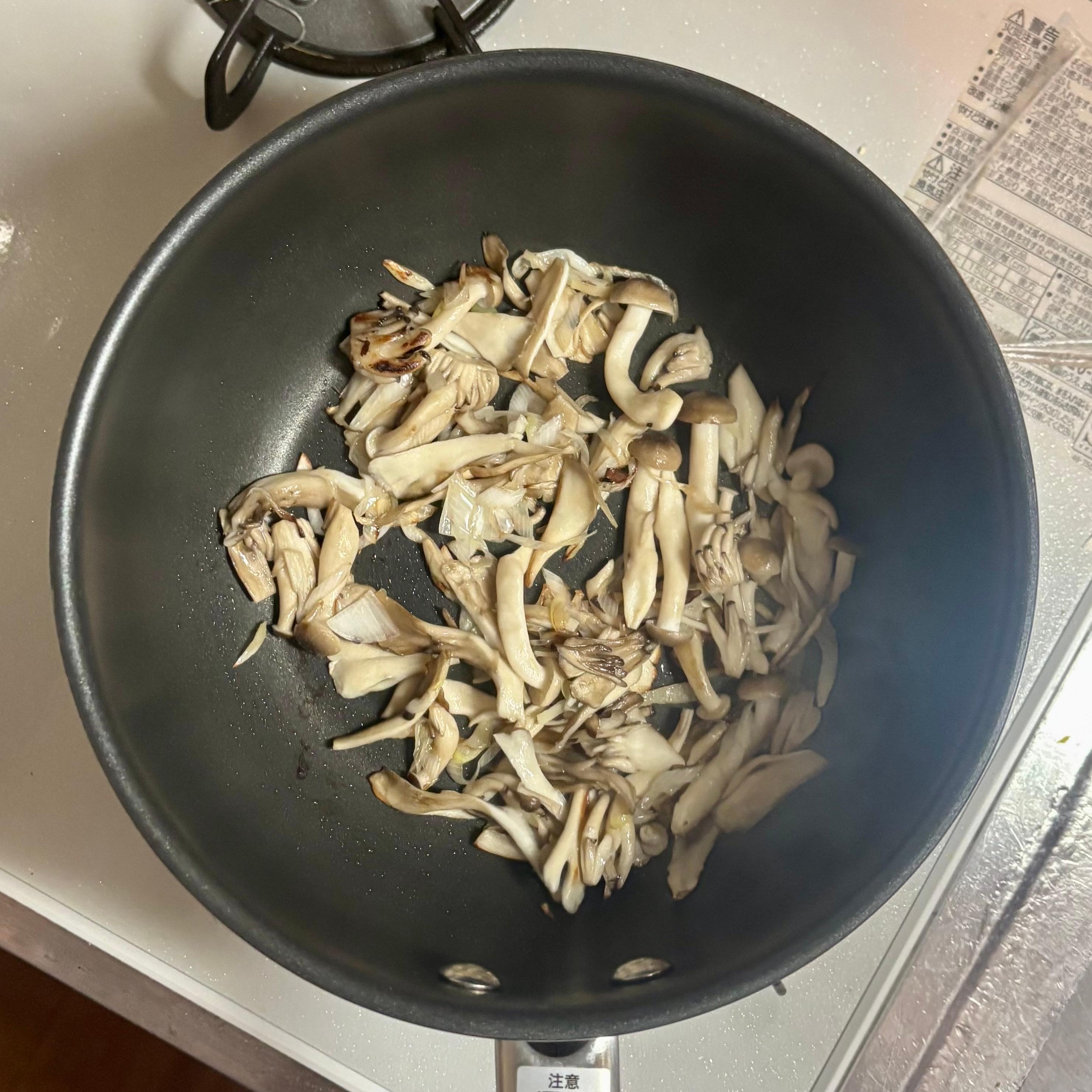 しめじ、まいたけを加えて中火にし、薄い焼き色がつくまでさらに2〜3分炒める。