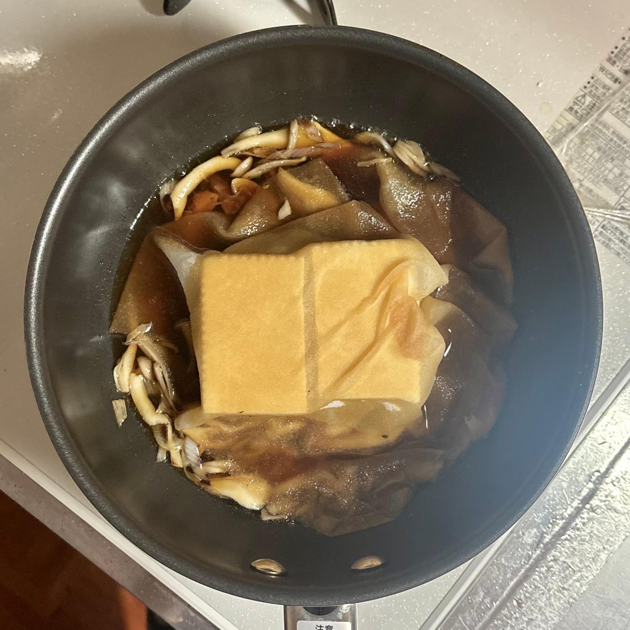煮立ったら①のクッキングペーパー(1枚)の水気を軽く絞り、落としぶたのように豆腐にかぶせ、弱火で5分ほど煮る。