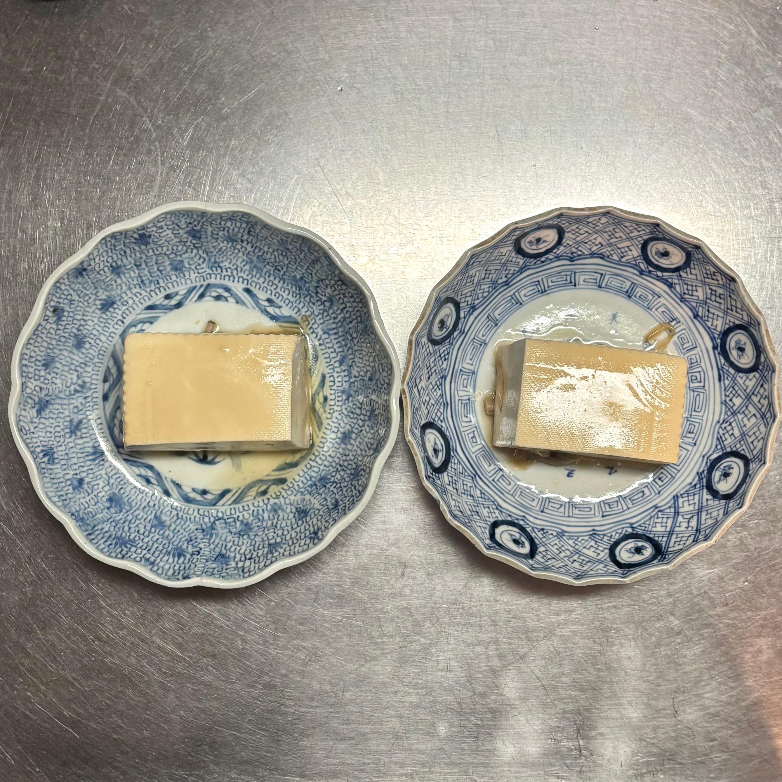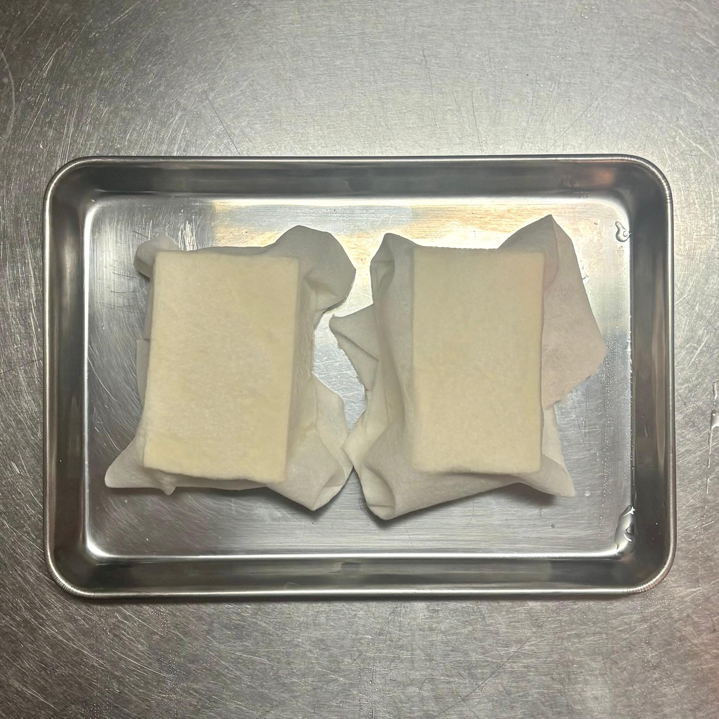 木綿豆腐は半分に切り、クッキングペーパーに1切れずつ包んで水きりをする。