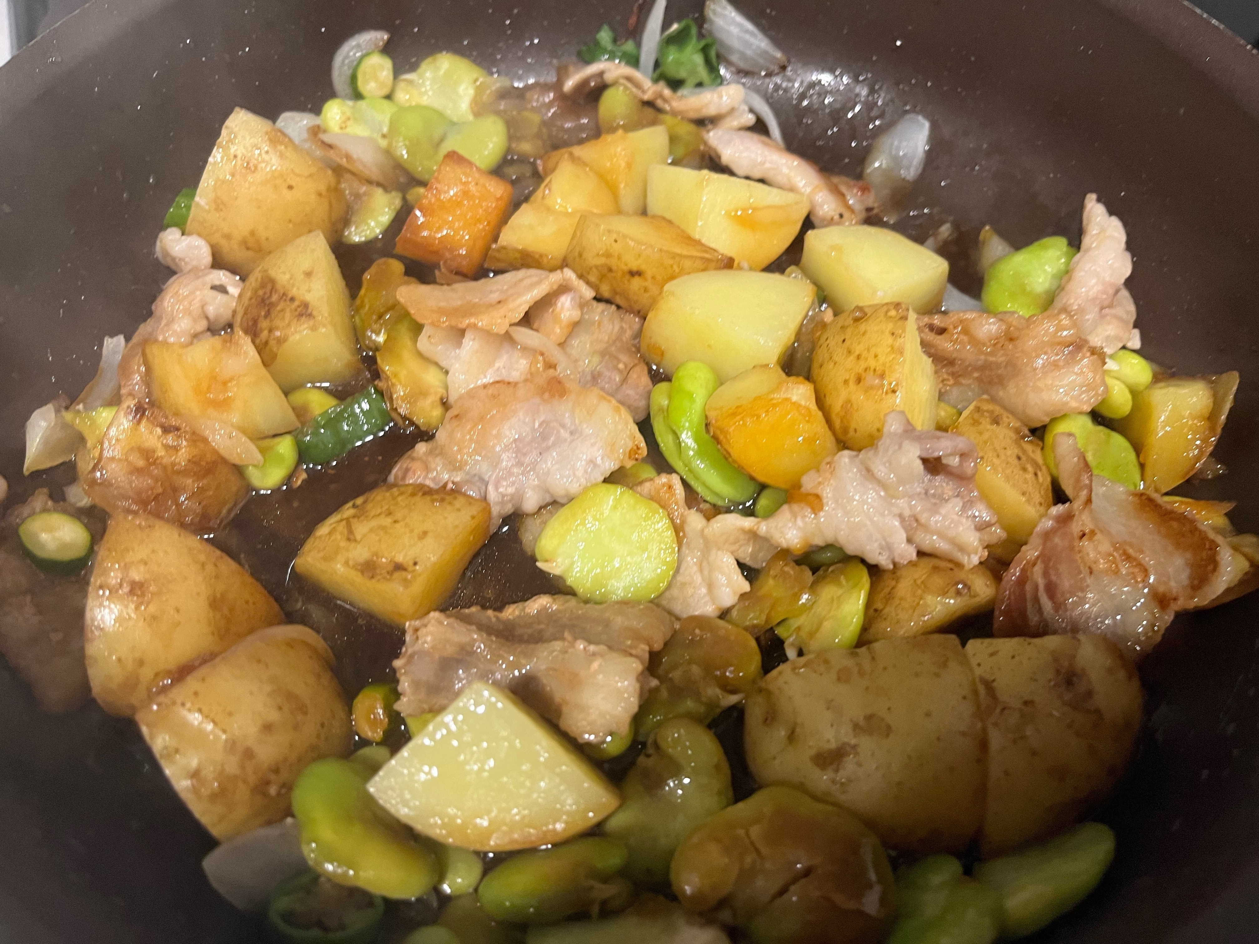 フライパンに分量外の油を入れて加熱し、イベリコ豚・たまねぎ(薄切り)・3のそら豆・レンジで加熱したじゃがいも(一口サイズ)を加えて炒め、さらに【A】と塩・黒胡椒で味付けする。
