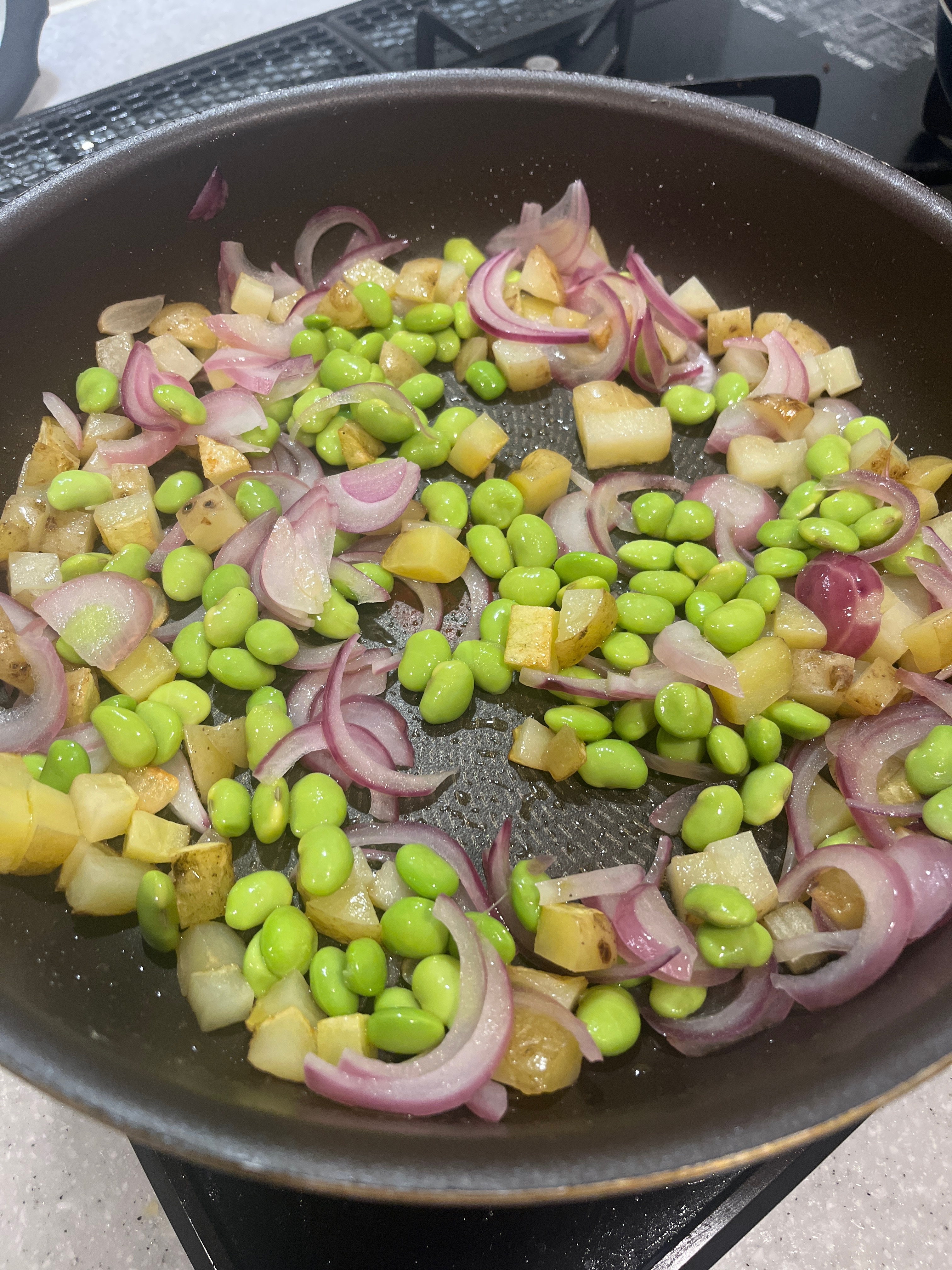 フライパンに分量外の油とにんにく(スライス)を入れて加熱し、じゃがいも(サイコロ状)と紫玉ねぎ(スライス)、枝豆の中身を炒める。