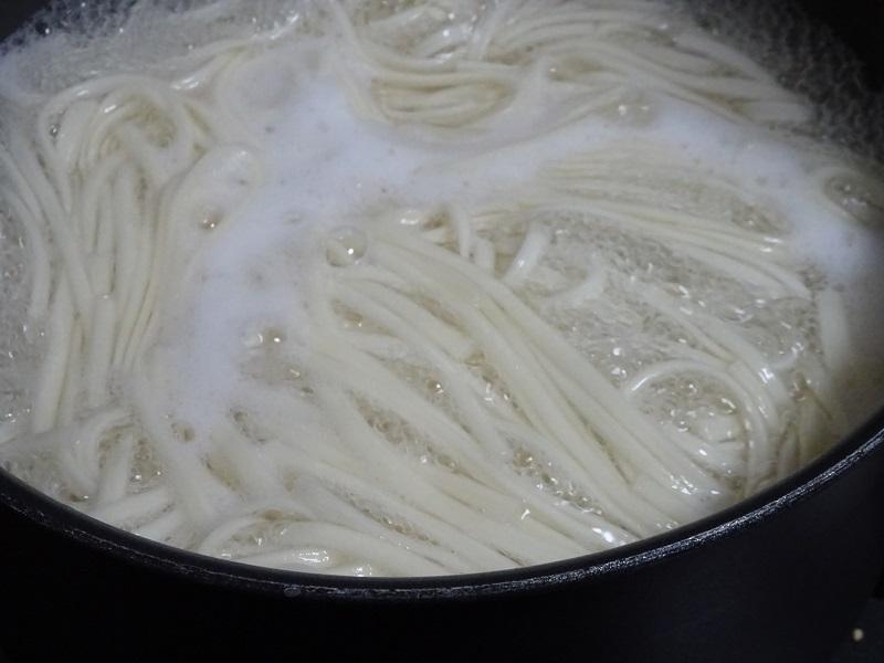 細うどんは表記通りに茹でて、流水にさらして、水気をきります。