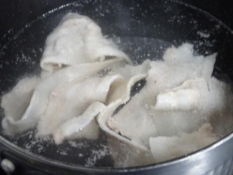 豚バラ肉は、長さを半分にカットして茹でて、水にさらして粗熱を取ります。