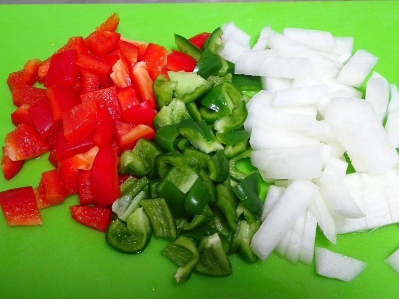 玉ねぎ・赤パプリカ・ピーマンは、5mm角程の大きさにカットします。