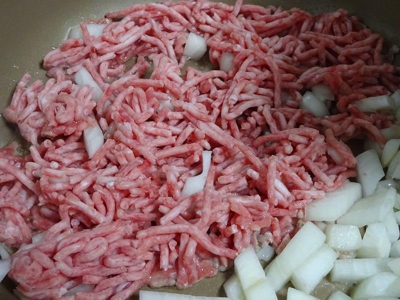 フライパンにごま油を熱し、玉ねぎとひき肉(今回は合いびき肉を使用)を炒めます。