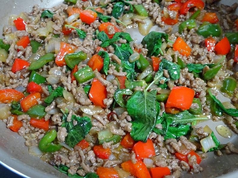 仕上げ用に4~6枚除いたホーリーバジルを加えて、サッと炒め合わせて、火を止めます。
