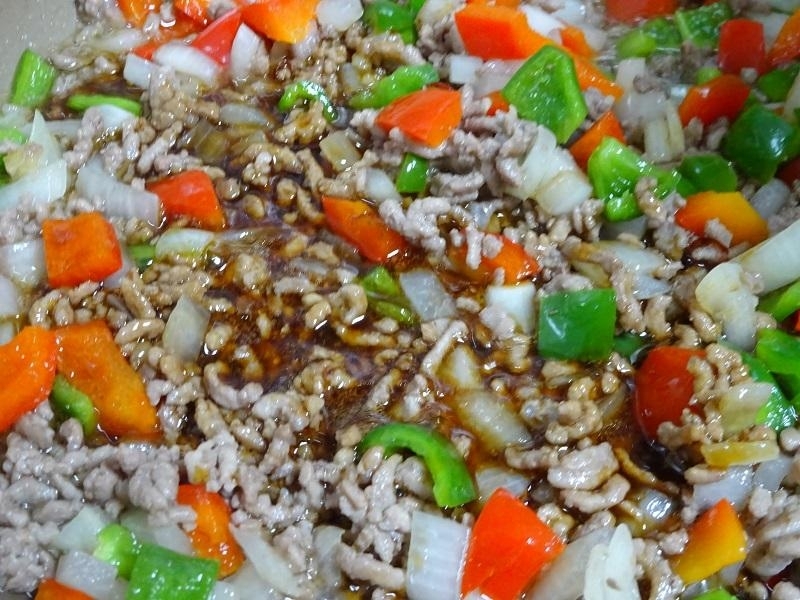 色が変わってきたら、パプリカ・ピーマン・鷹の爪を加えて炒めます。