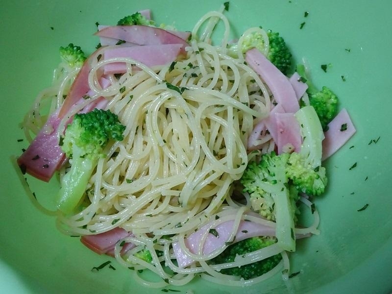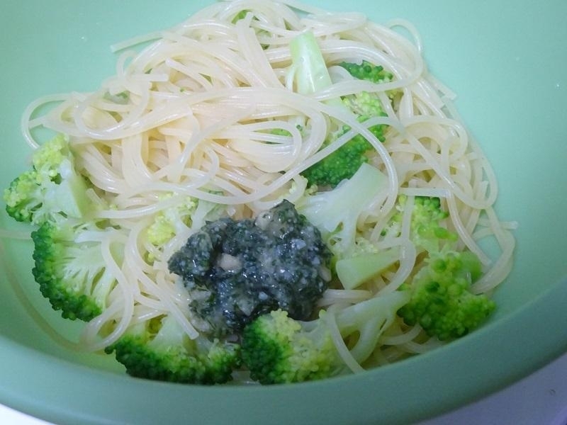 鍋に湯を沸かして塩少々(分量外)を加え、パスタと①のブロッコリーを3分(パスタの表記通りの茹で時間)茹でます。