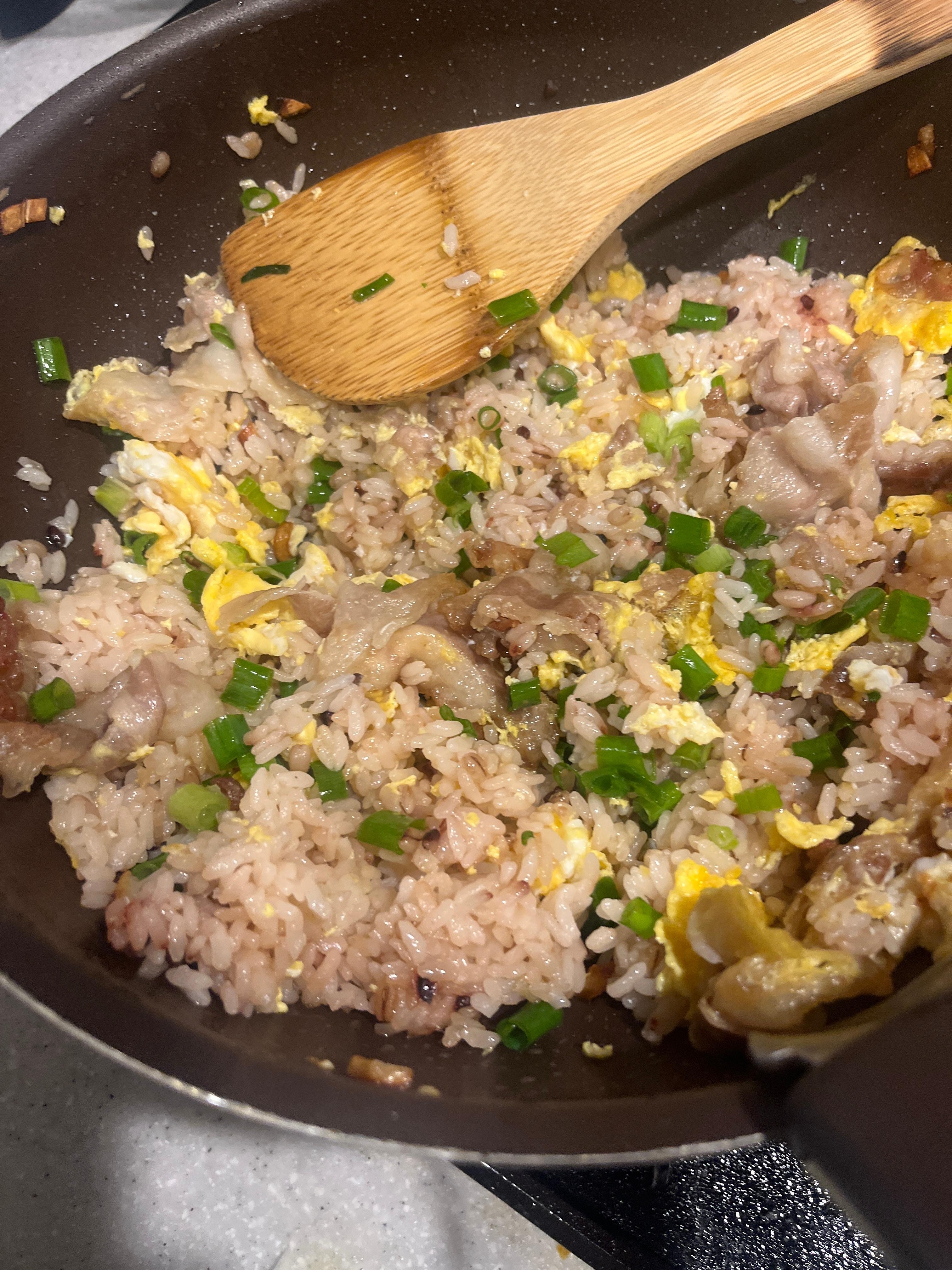 炊いたご飯とねぎ、塩(小さじ1/2)、味の素(7振)を加えて炒めれば、完成!