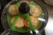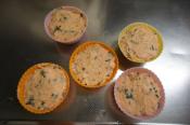シリコンカップにつめる。表面をなめらかにするときには、スプーンに水をつけてならすときれいになる。