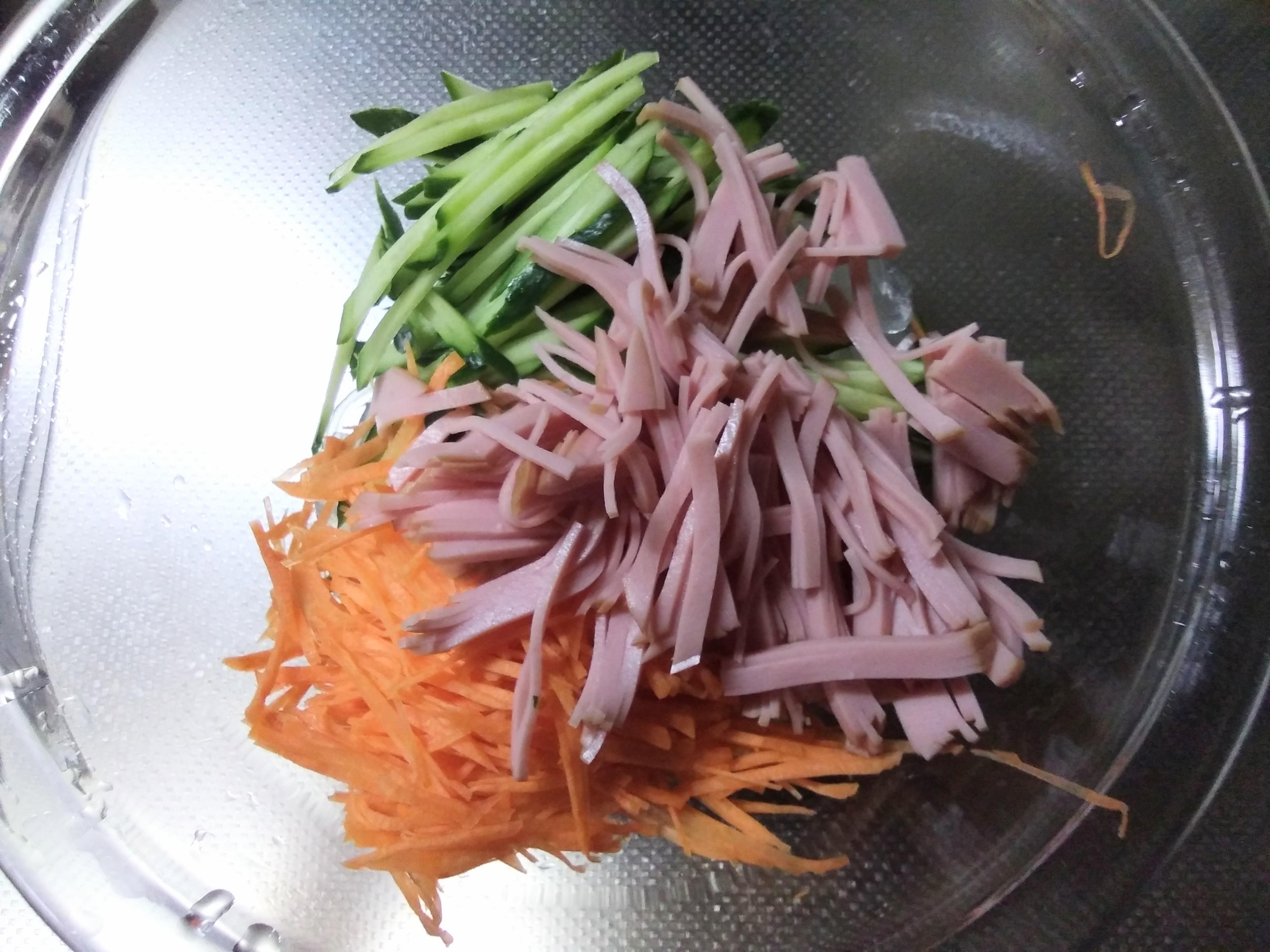 ボウルに葛切り、胡瓜、人参、ロースハムを入れます。