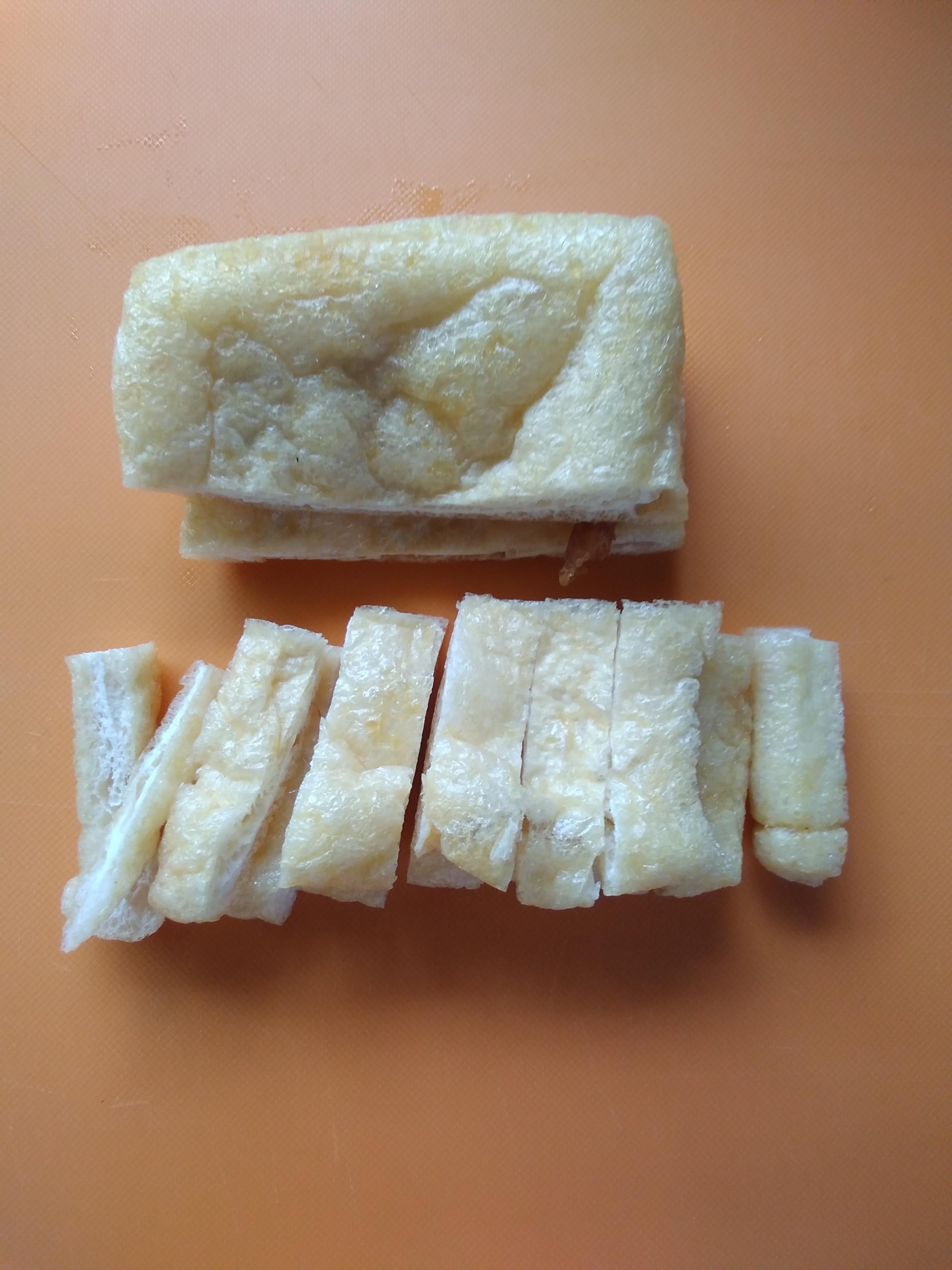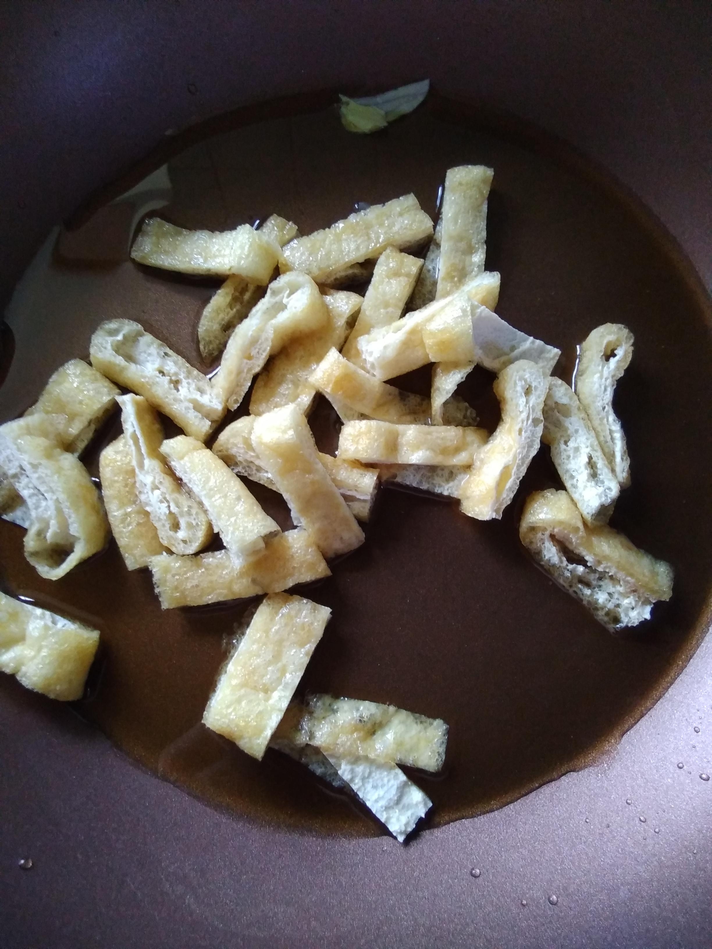 鍋に水、みりん、醤油、シマヤだしの素を入れ混ぜ合わせ油揚げを加えます。