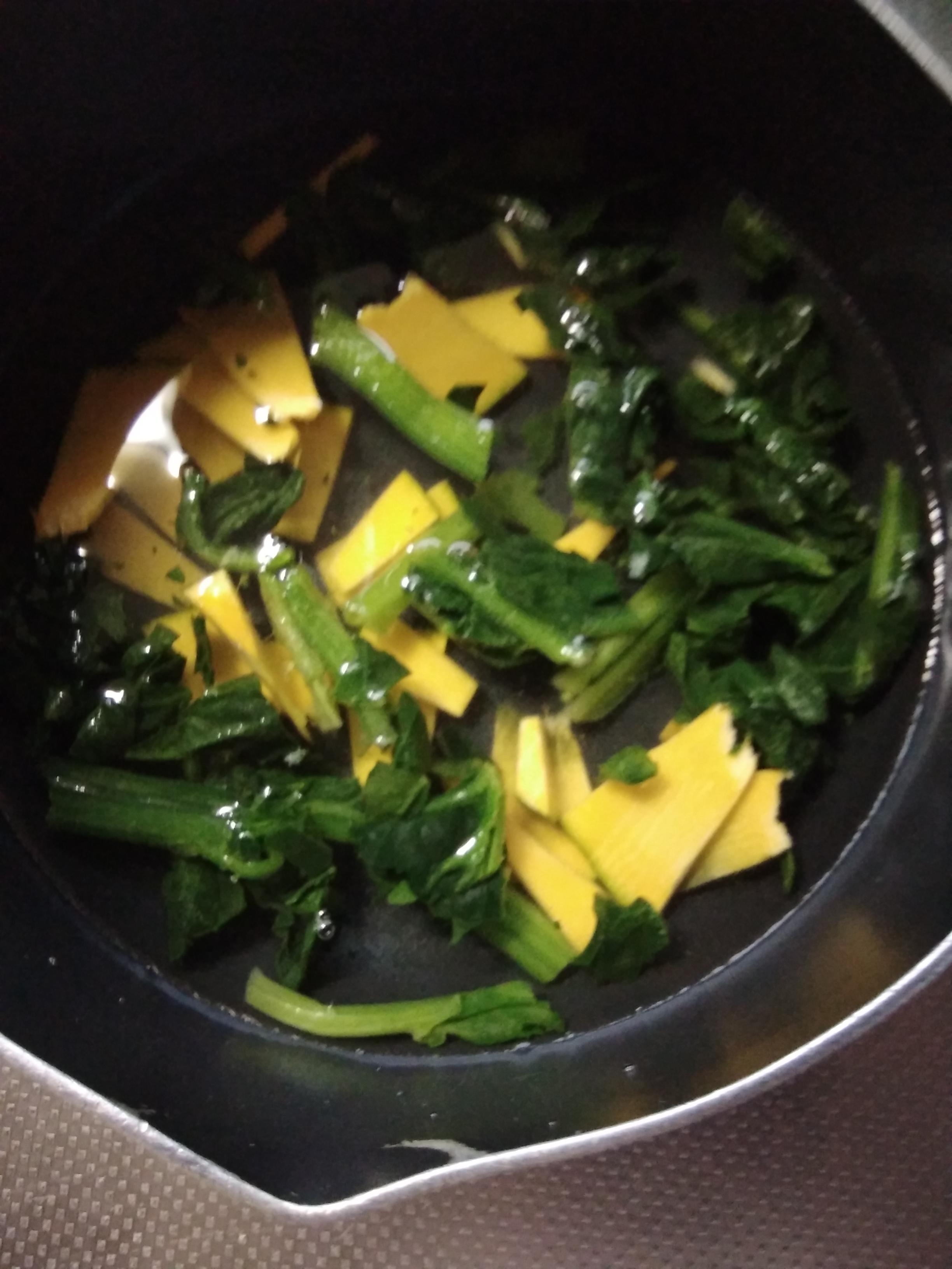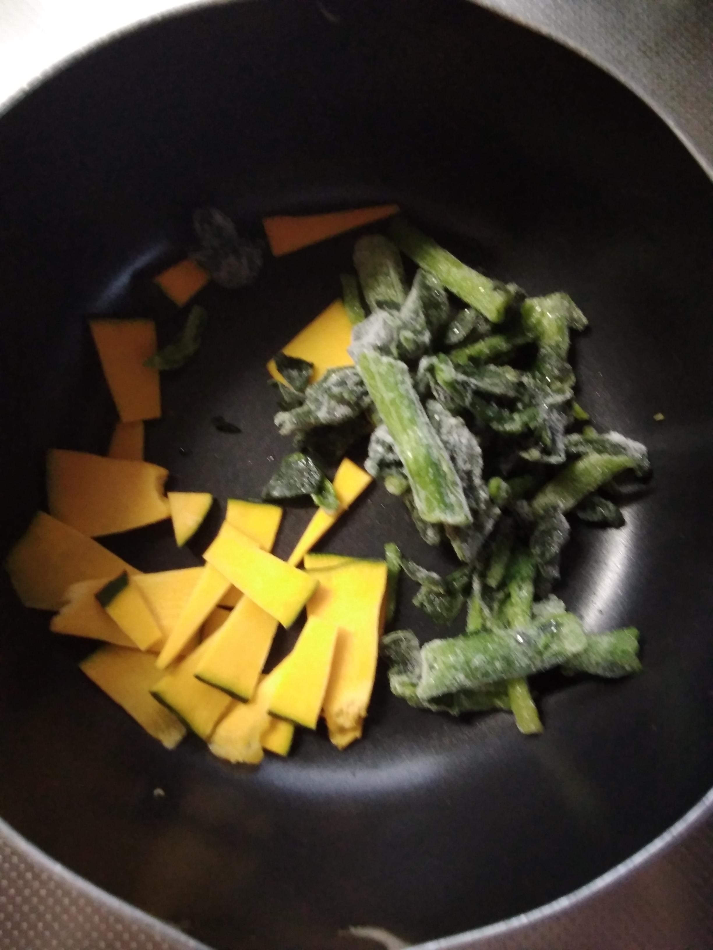 鍋にかぼちゃと冷凍ほうれん草を入れます。
