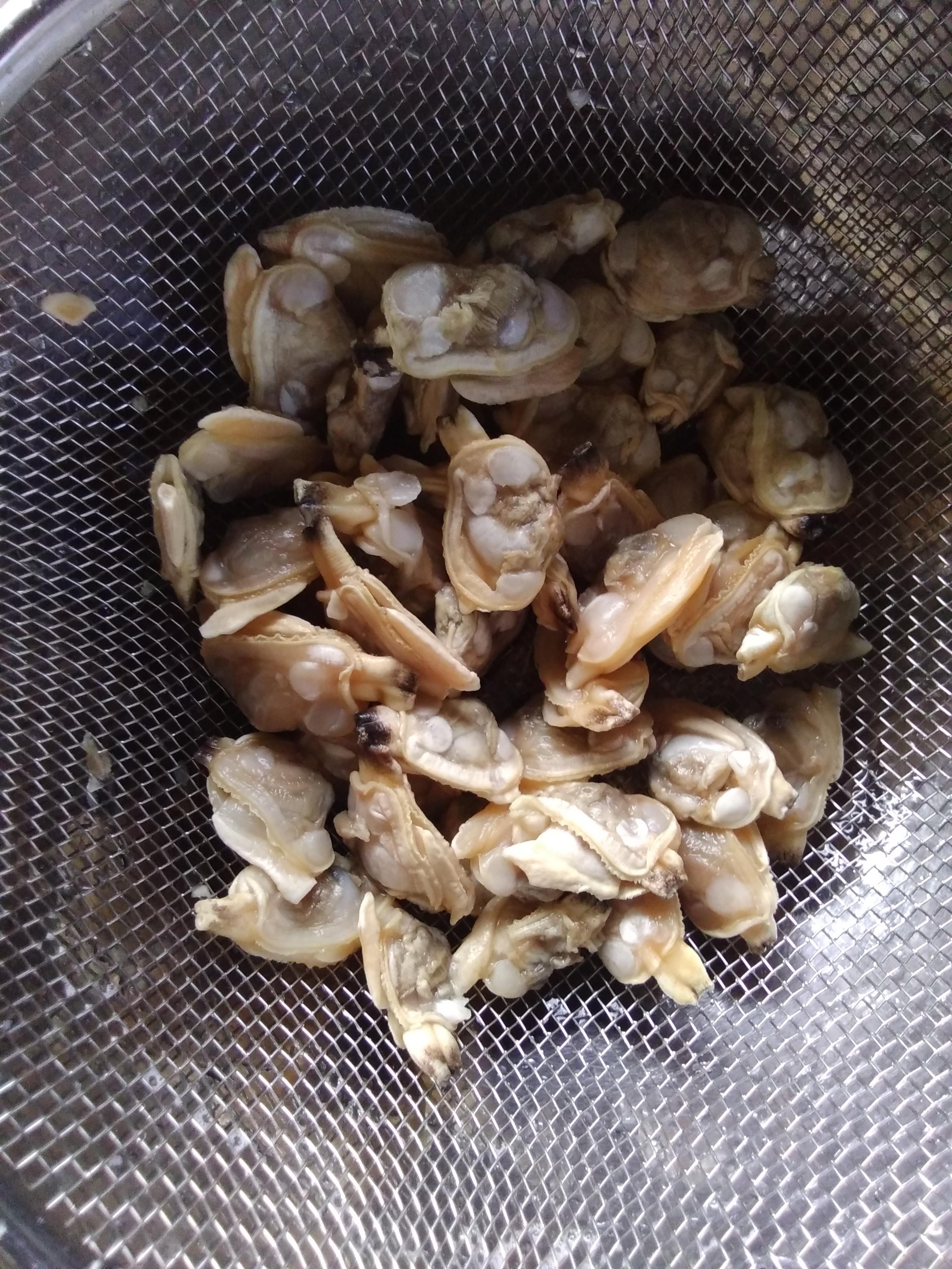 霜が付いた冷凍剥きあさりを流水解凍して使いました。