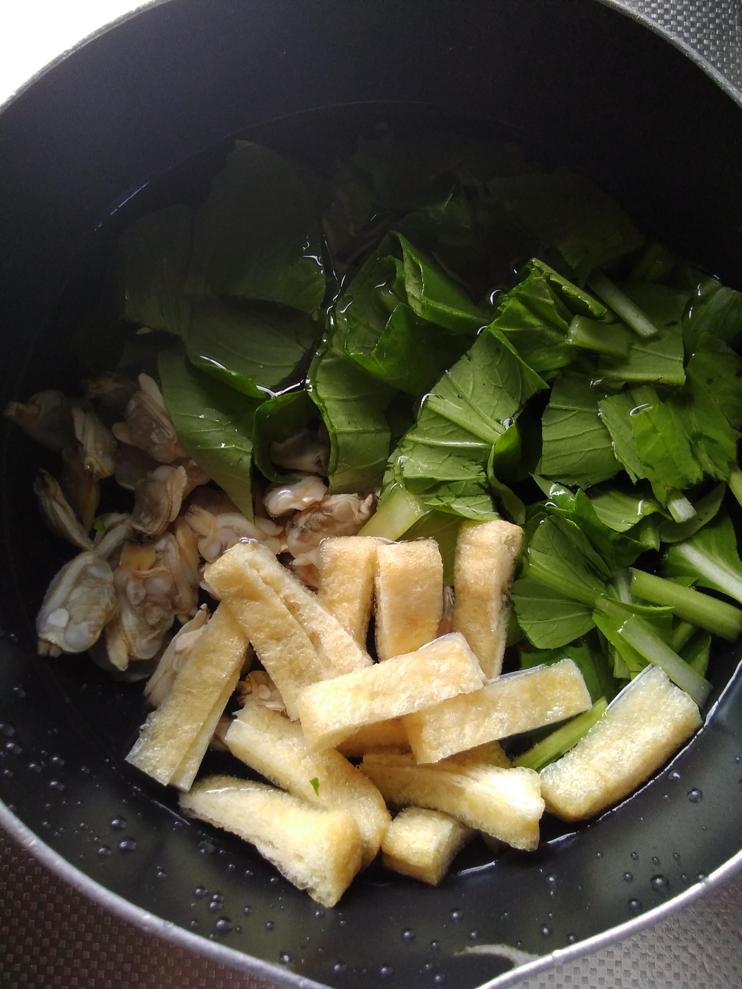 鍋に冷凍剥きあさり、小松菜、油揚げを入れます。