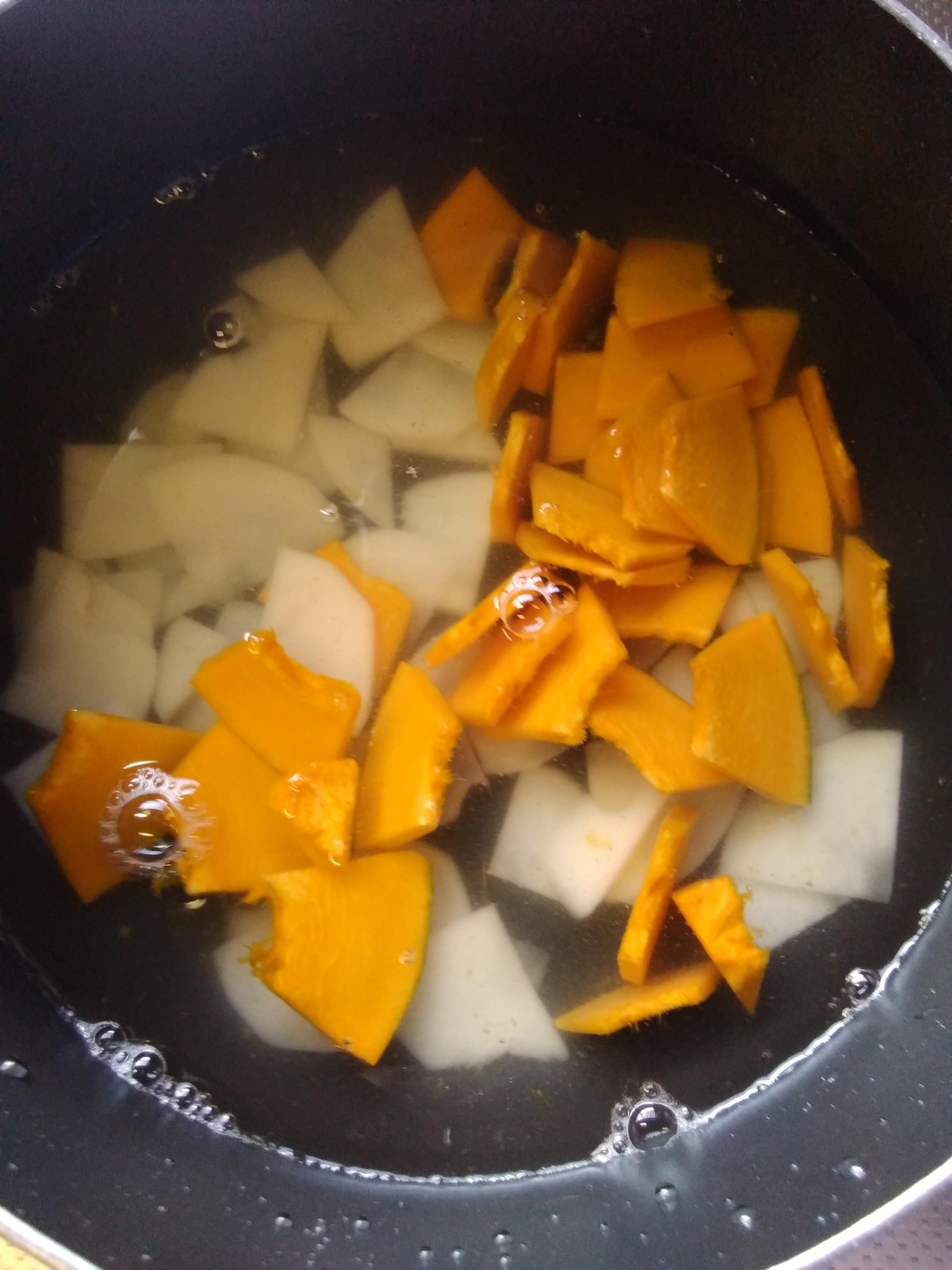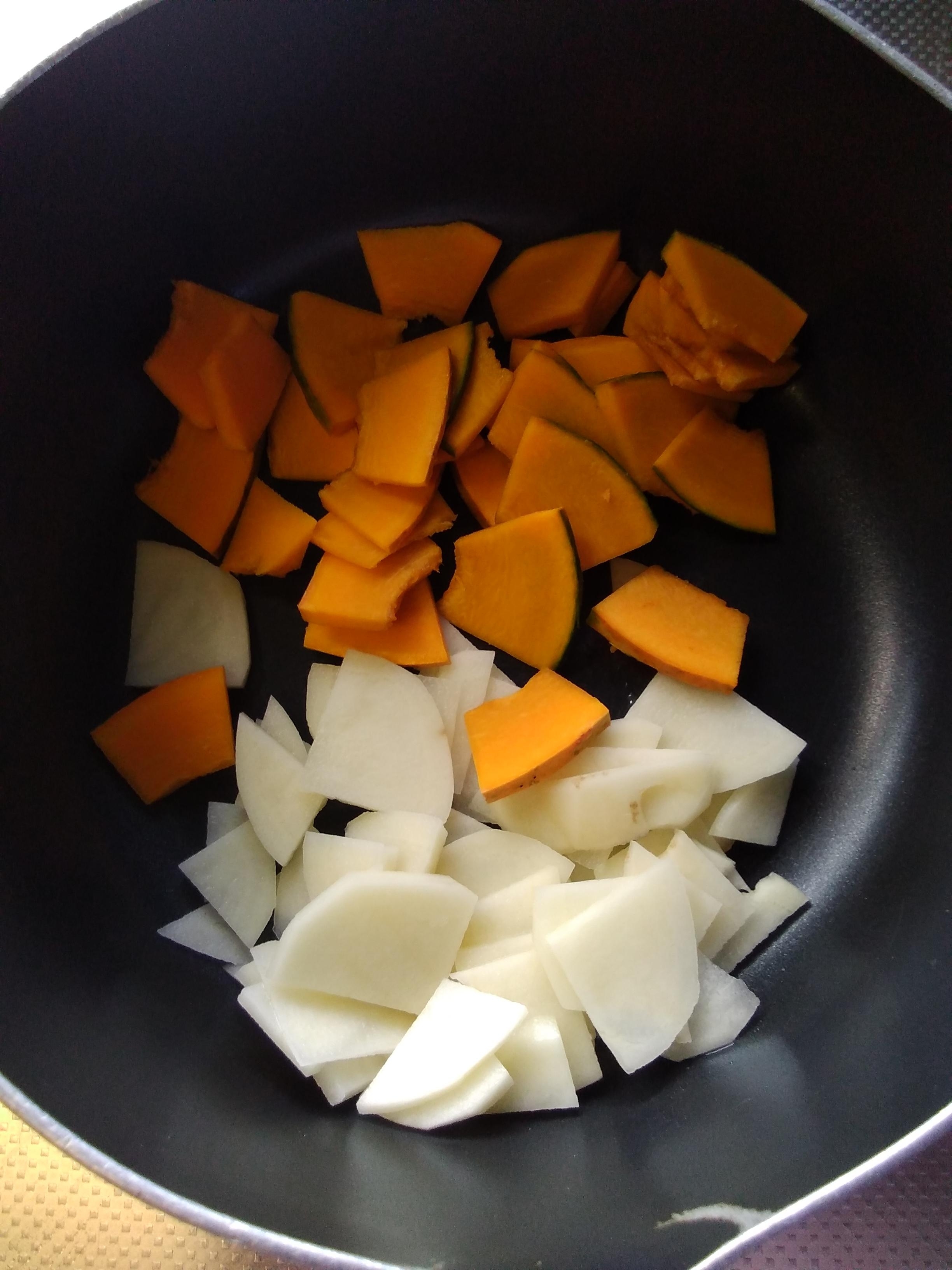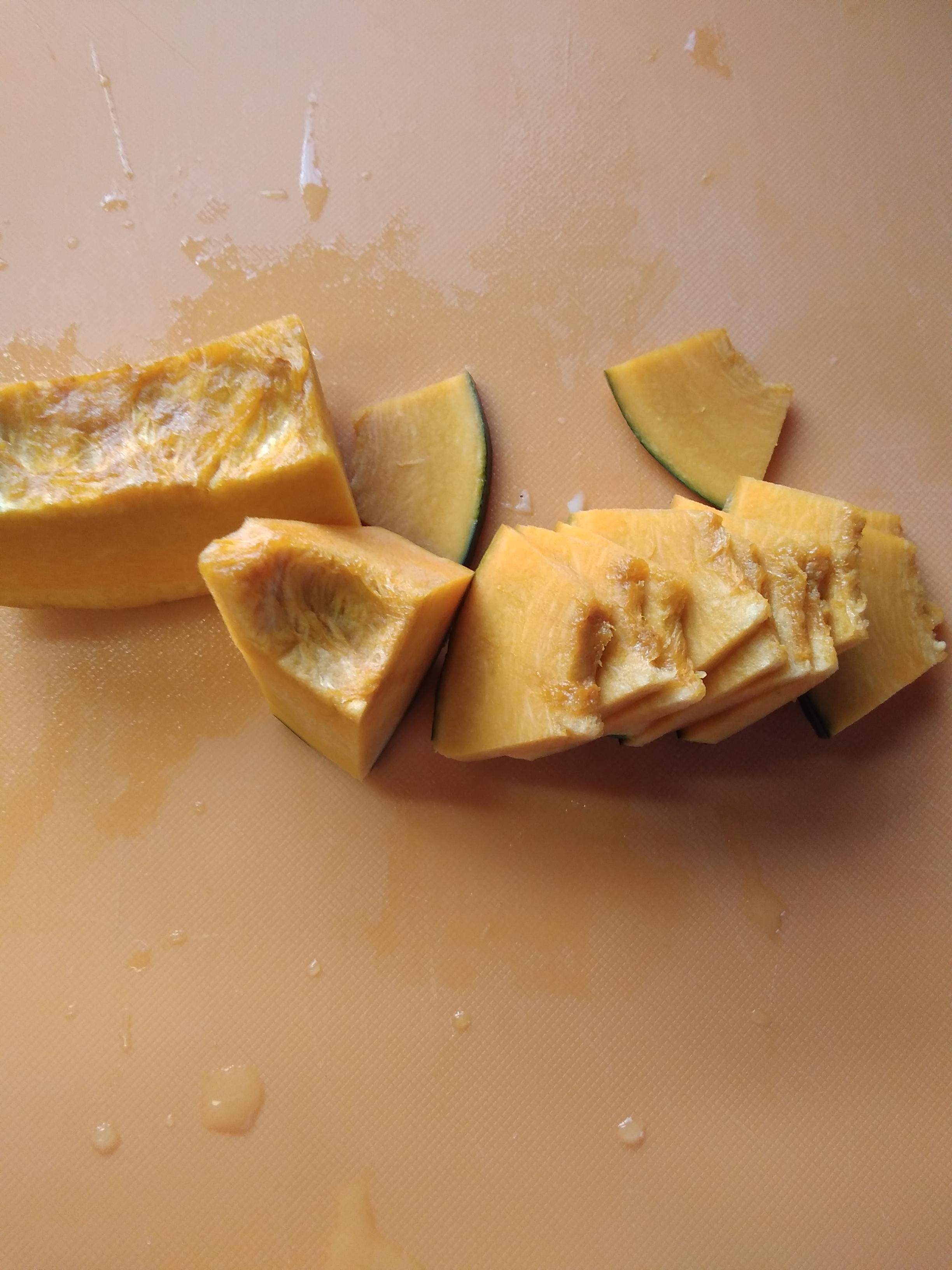 ポイボスさん♬収穫したかぼちゃとじゃがいもでお味噌汁、夕飯用に作りました✨いただくの楽しみです♥