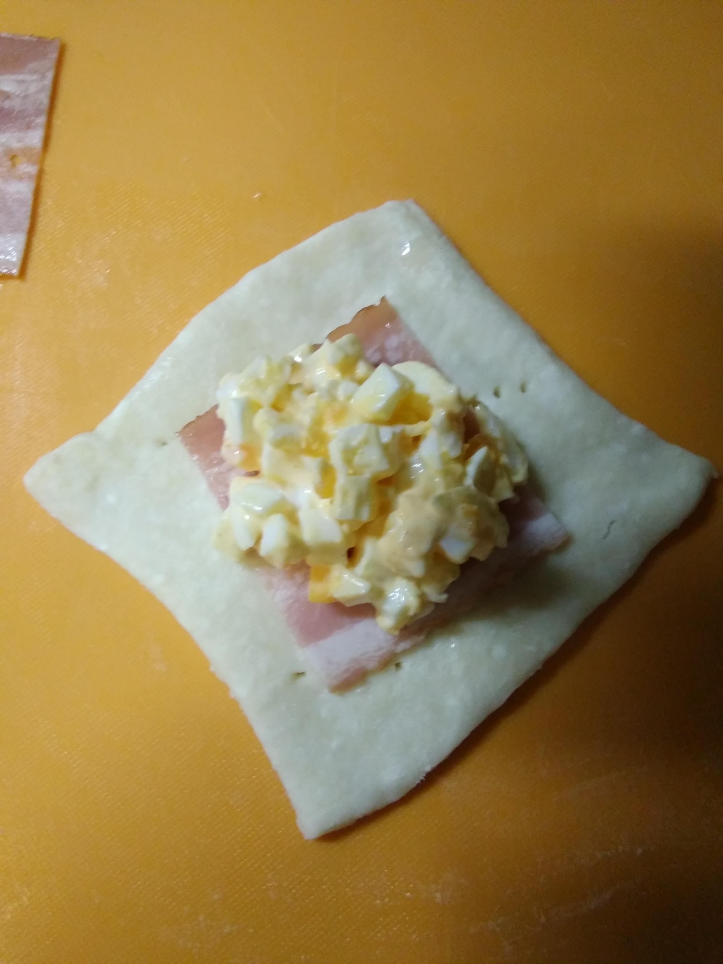 14に12の卵サラダをのせます。