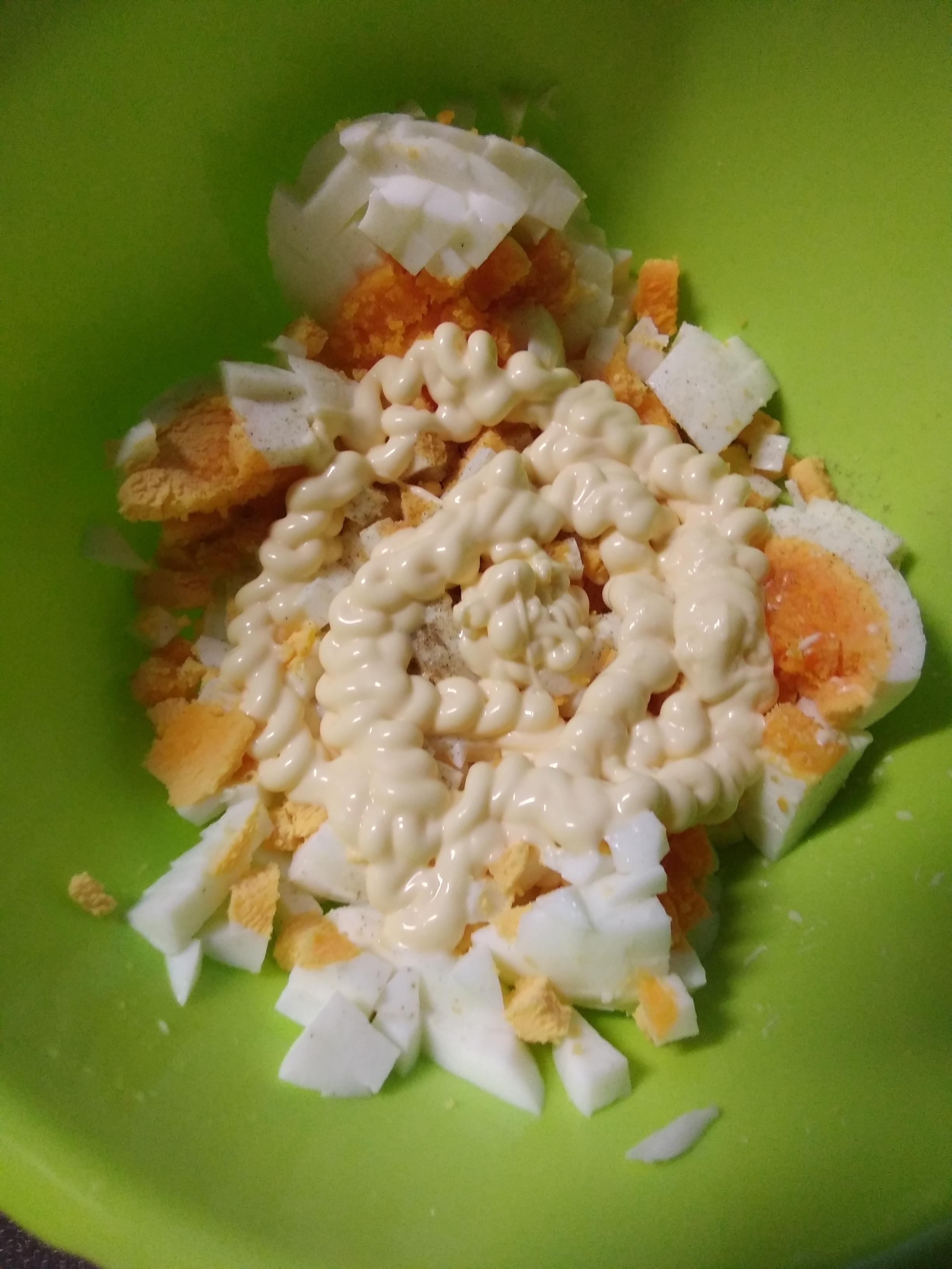ボウルに11の卵、マヨネーズ、塩胡椒を入れ混ぜ合わせます。