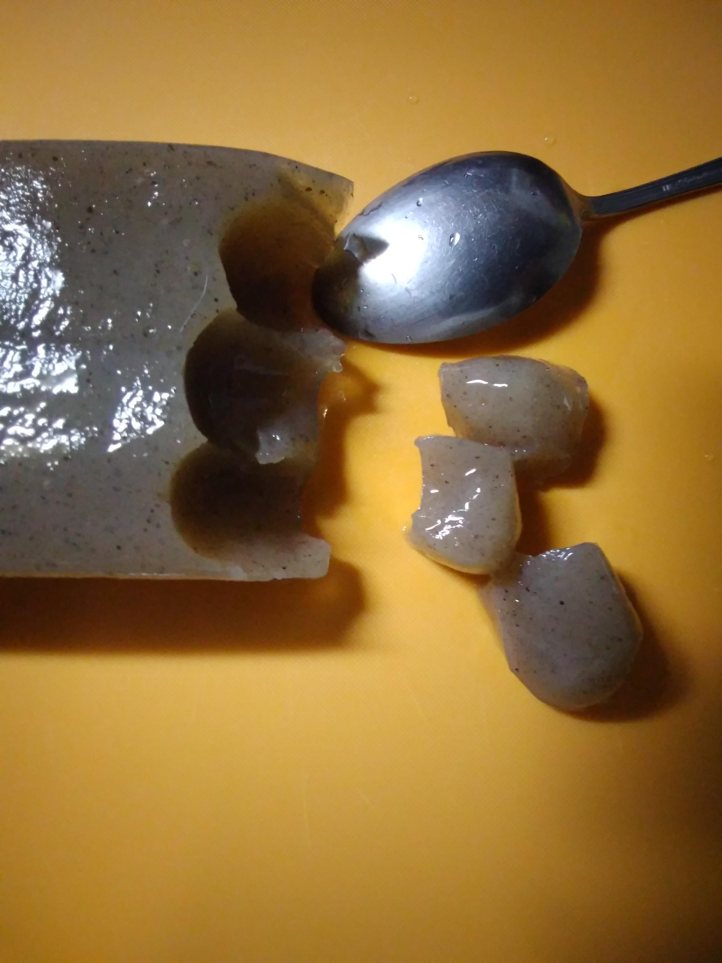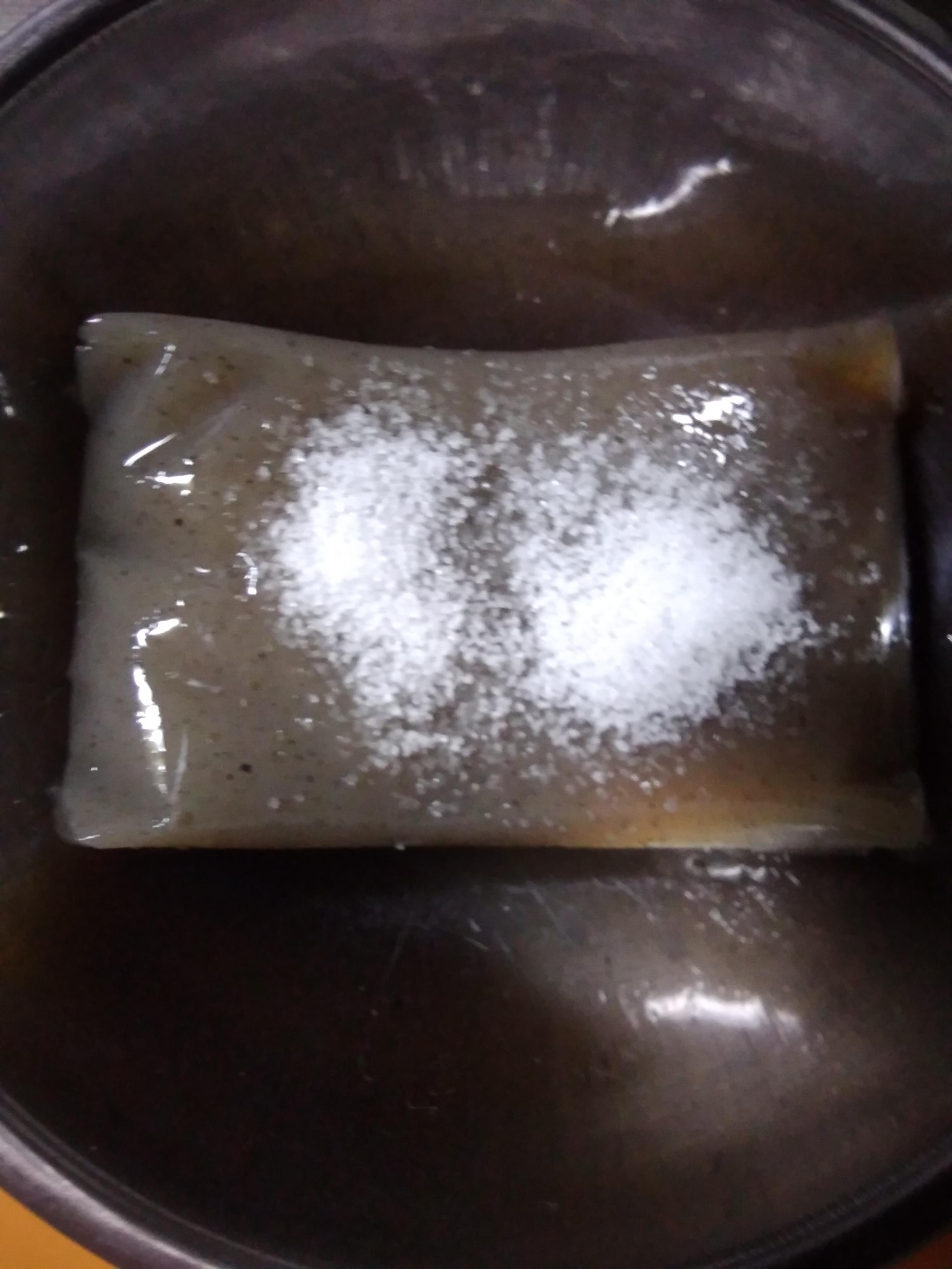 板蒟蒻に砂糖(蒟蒻用)をまぶし水で洗い流します。