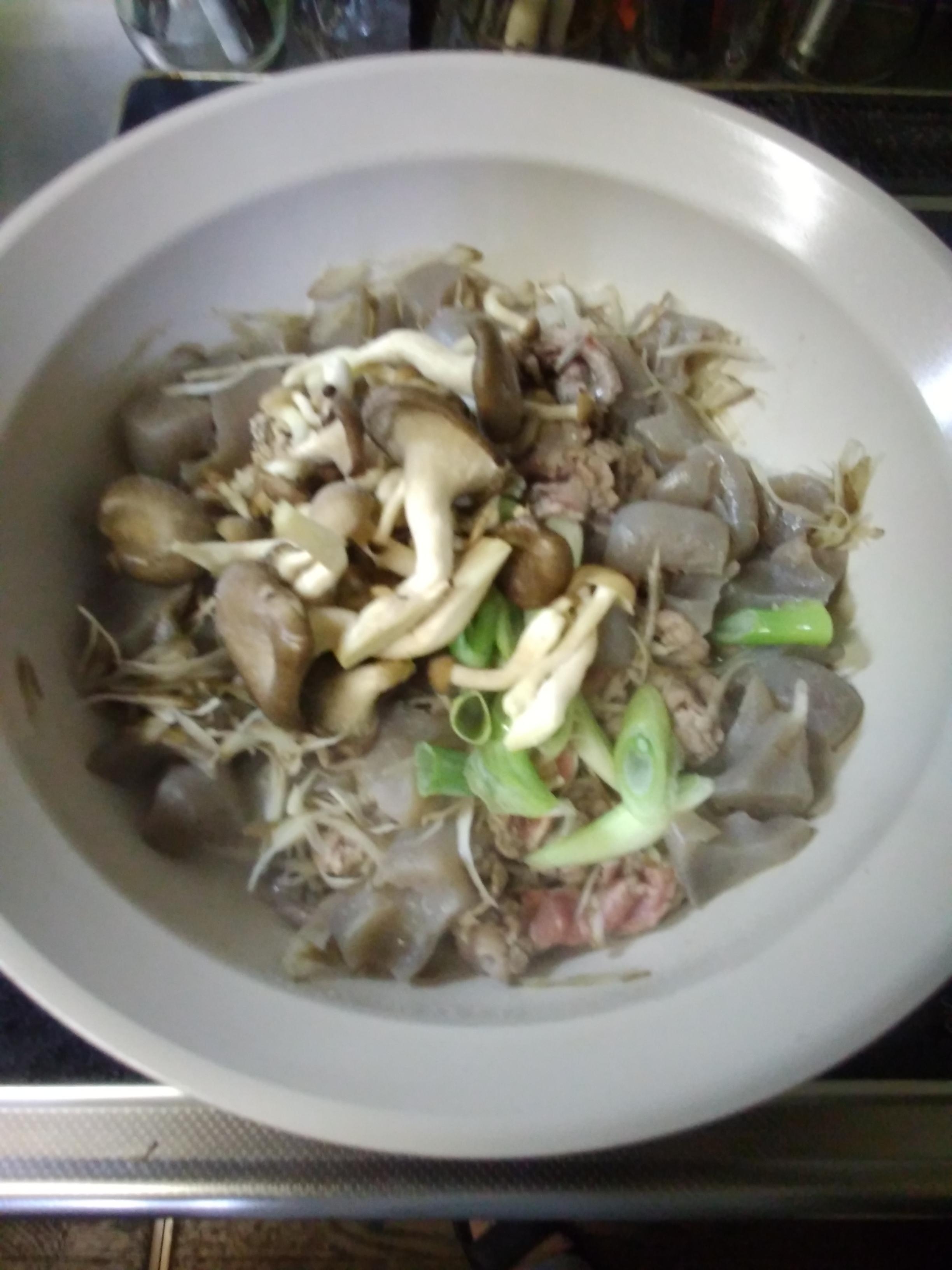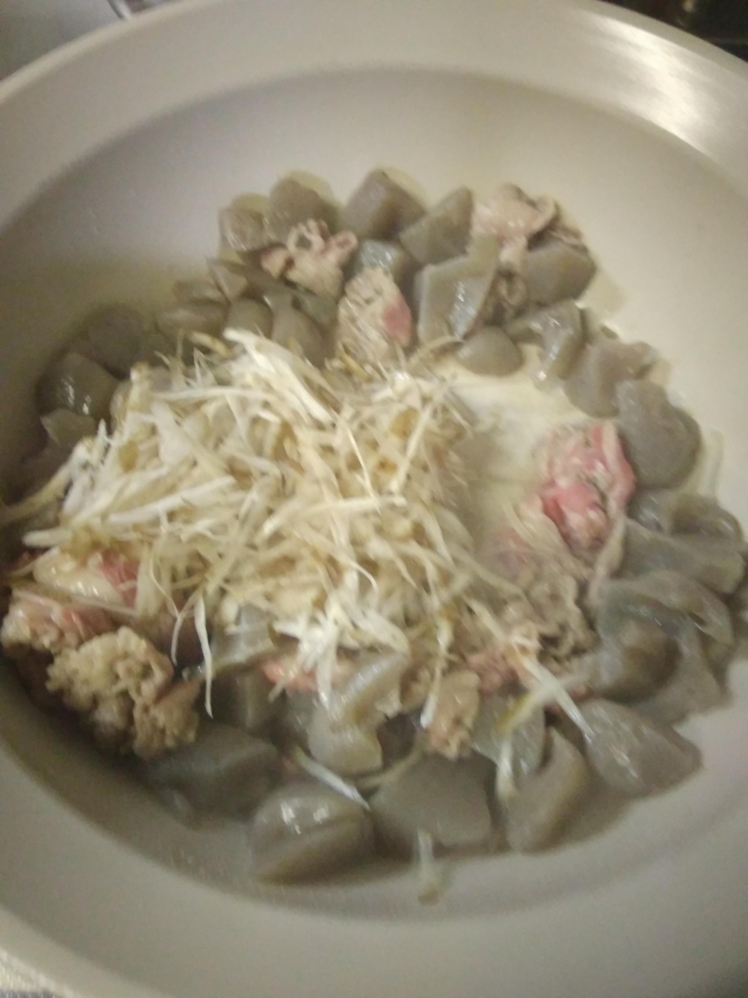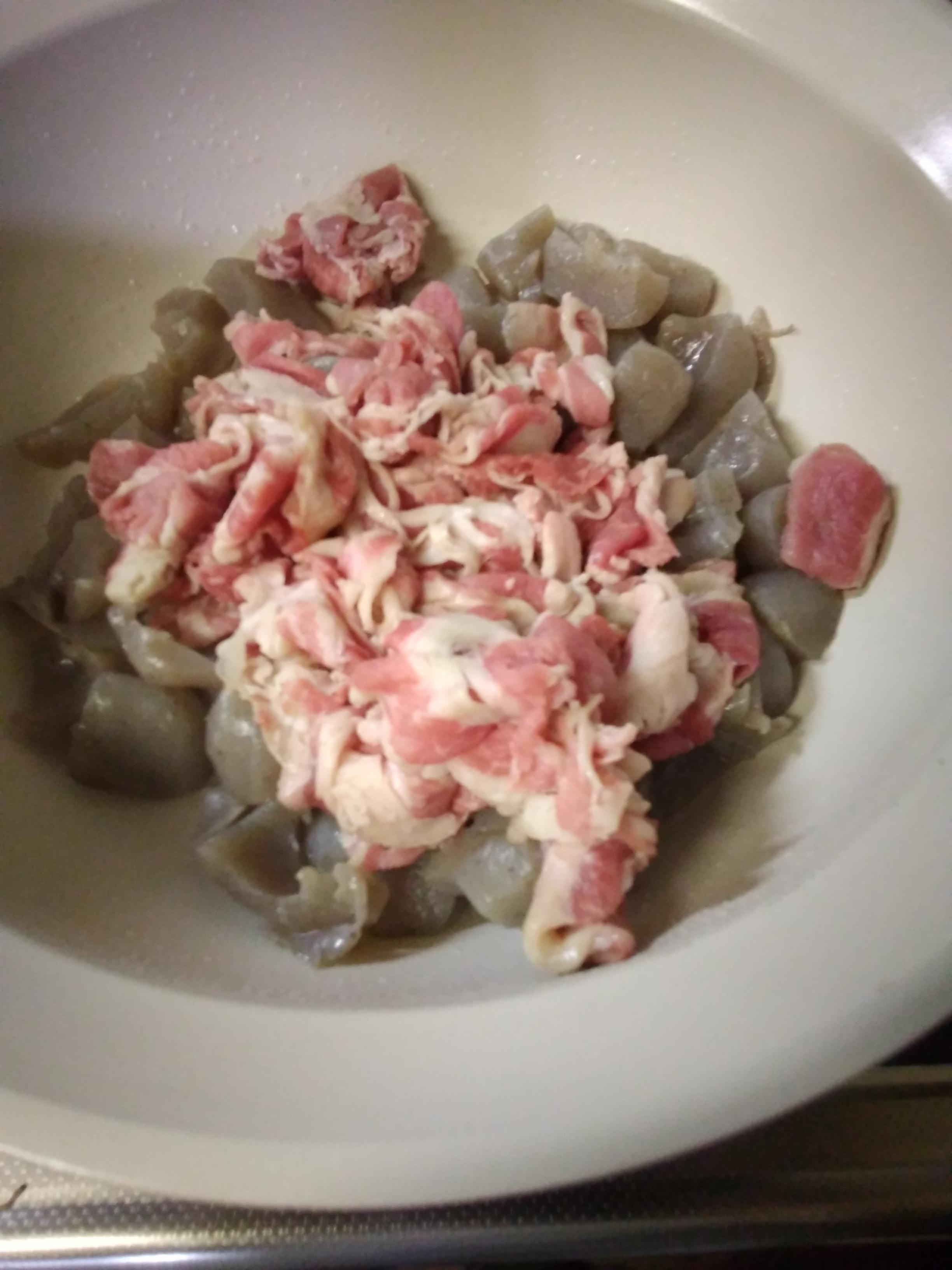鍋にサラダ油を入れ板蒟蒻を炒めます。