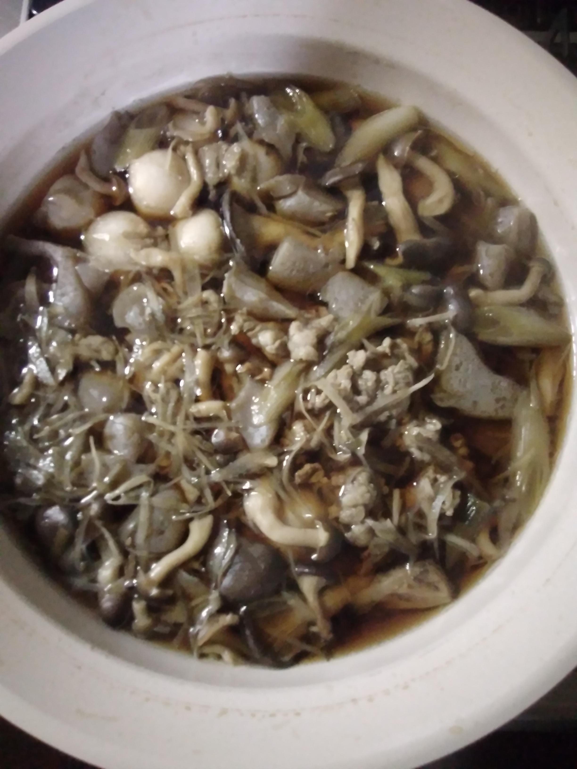 11に長ねぎの白い部分とヒラタケとしめじを入れ炒めます。