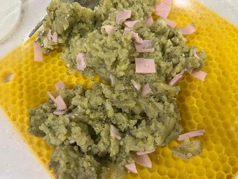 じゃがいもと玉ねぎを耐熱皿でレンチンして、フォークで潰してから塩胡椒します。