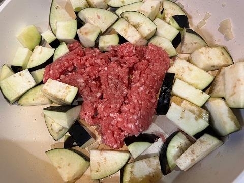 ごま油で茄子を炒め、少し透き通ってきたらひき肉を加えてほぐしながら炒め塩をふります。
