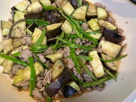 - 茄子とひき肉の豆板醤ピリ辛炒め