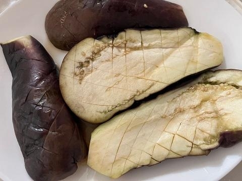 茄子はヘタを取り縦に4当分、網目状に切れ目を入れてレンチンします。麺つゆをかけて染み込ませます。