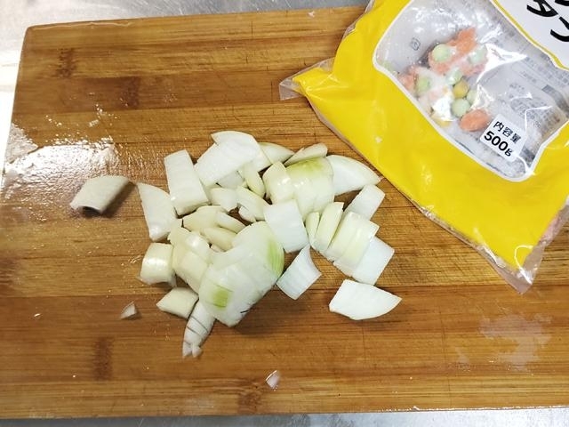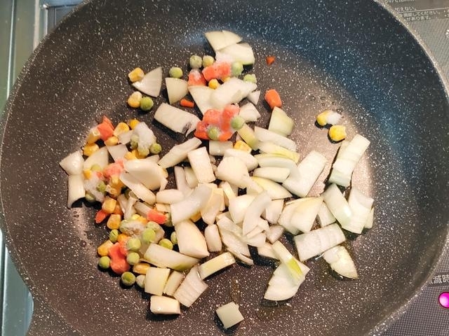 フライパンに油を引き、弱めの中火で玉ねぎ、ミックスベジタブルを炒める。