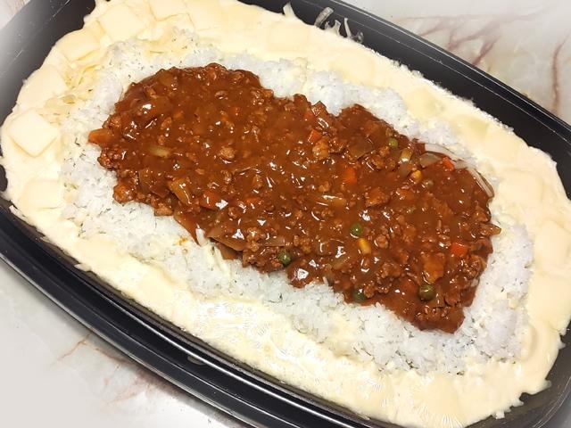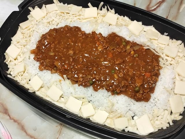 チーズを溶かし終えたら、火を保温にしないと、チーズがカリカリになってしまいます。 なので、チーズが溶けて時間が経つようなら、一旦火を止めても良いかもしれません。 ドライカレーに味が付いてるので、あえて白飯には味を付けていません。