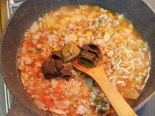 フライパンが沸騰した後、一旦火を止め、カレールーを溶かす。