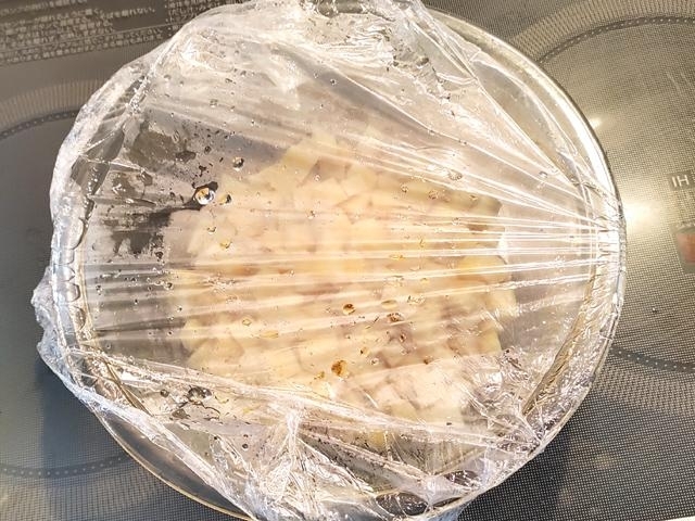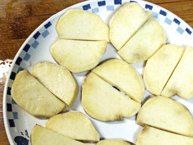 二次発酵している間に、さつまいもの皮をむいて薄切りにしたものを10枚用意して、耐熱皿に乗せ、2~3分ほど加熱し、冷ましておく。