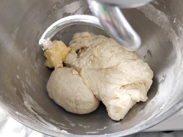 - 8 ※スタンドミキサーがない場合は、大きめのボールに生地を入れて、カードなどで混ぜ、台の上で10分ほど捏ねて、生地の中にマーガリンを入れて、表面が滑らかになるまで捏ねてください。