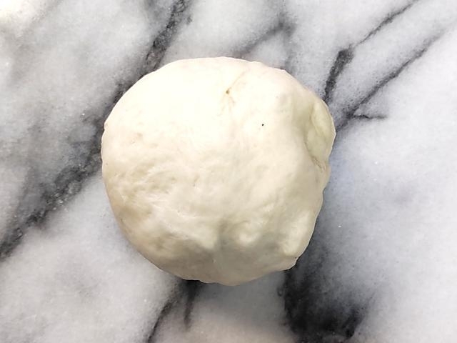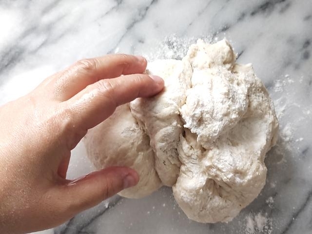生地がフックに絡んで動かなくなったら、台に取り出し、強力粉を軽く振って打ち粉(分量外)をし、10分ほど捏ねて、表面が滑らかになればOK。