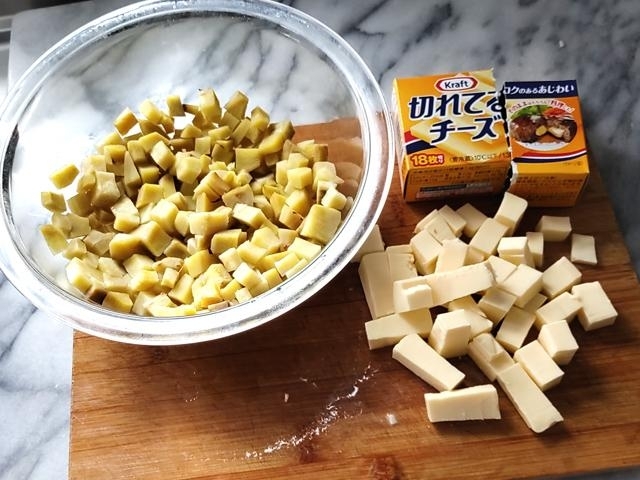生地を発酵させている間に、チーズもサツマイモと同じくらいの大きさになるまでカットしておく。