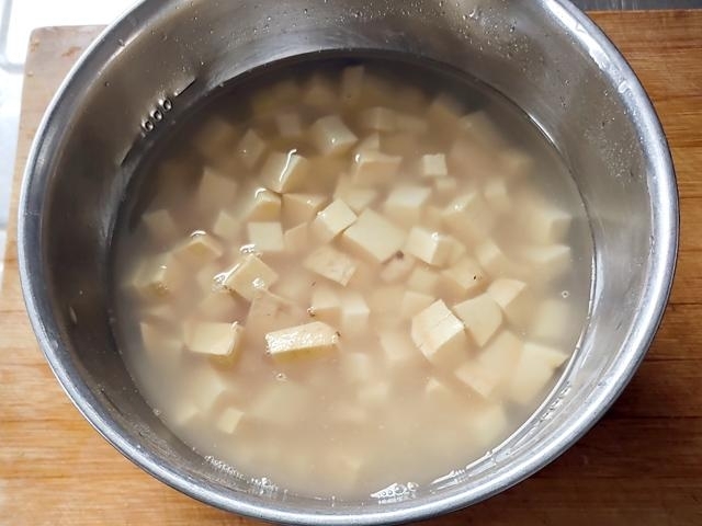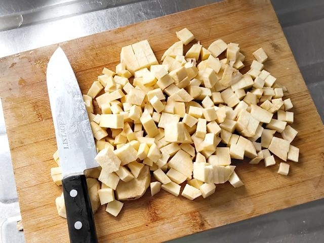具材用のサツマイモは皮をむき、1cm角くらいの角切りにする。